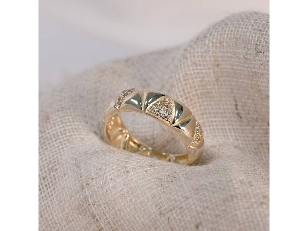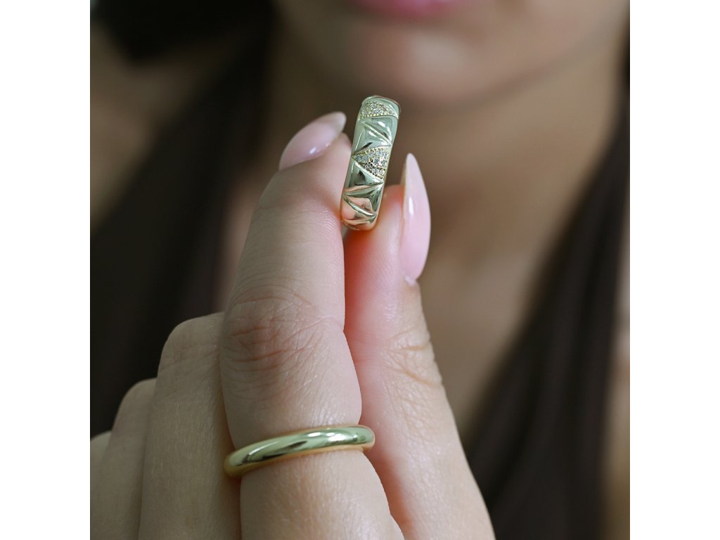 Prsten s čirými krystaly a pozlaceným stříbrem je symbolem elegance. Jeho precizní brus a zlatý lesk zaujmou na první pohled.