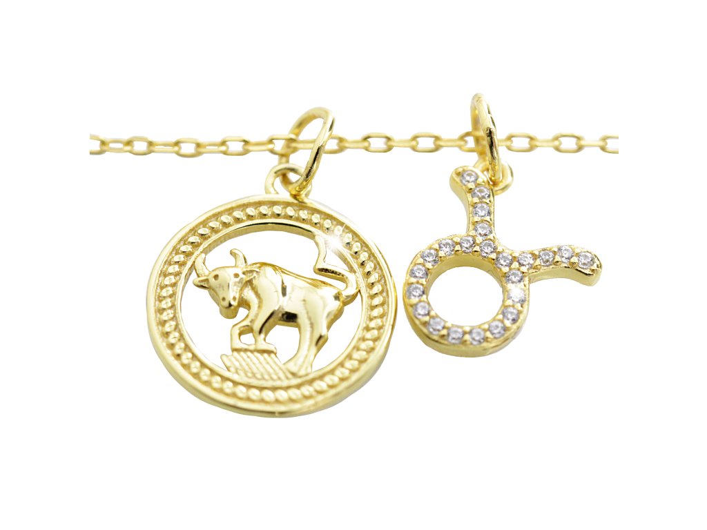 Pozlacený stříbrný náhrdelník dva přívěsky znamení zvěrokruhu s Kubickými zirkony Býk (Stříbro 925/1000)