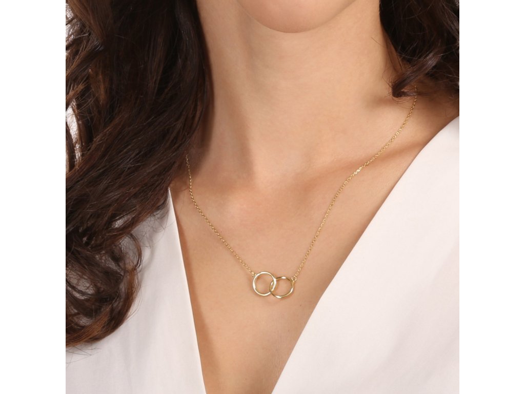 Náhrdelník se dvěma do sebe propletenými kroužky symbolizuje nekonečnou lásku a věčné spojení. Je dokonalým vyjádřením nezlomného pouta. Ať už je tento šperk dárkem pro vaši drahou polovičku nebo připomínkou pouta s blízkou kamarádkou, jeho symbolika je věčná.