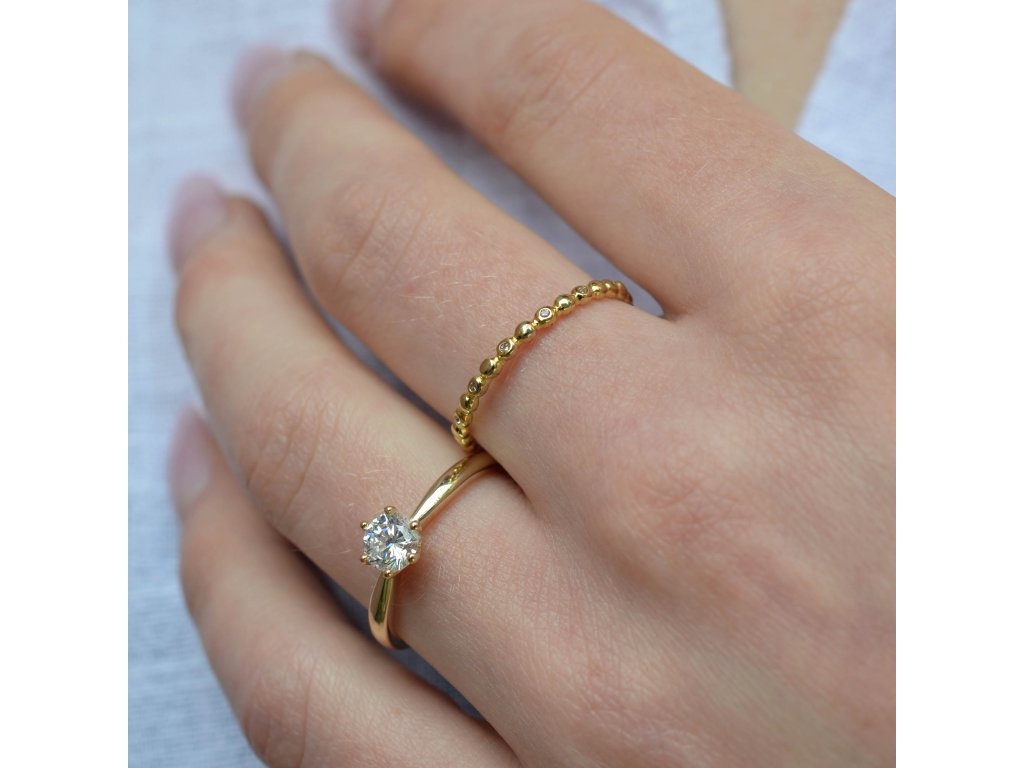 Čisté, oblé linie pozlaceného kroužku dávají vyniknout jednomu průzračnému zirkonu, kterým je prsten osazen. V jednoduchosti je krása a totéž platí i o tomto prstenu. Jeho síla spočívá v souhře kovového lesku a rozzářeného kamenu.
