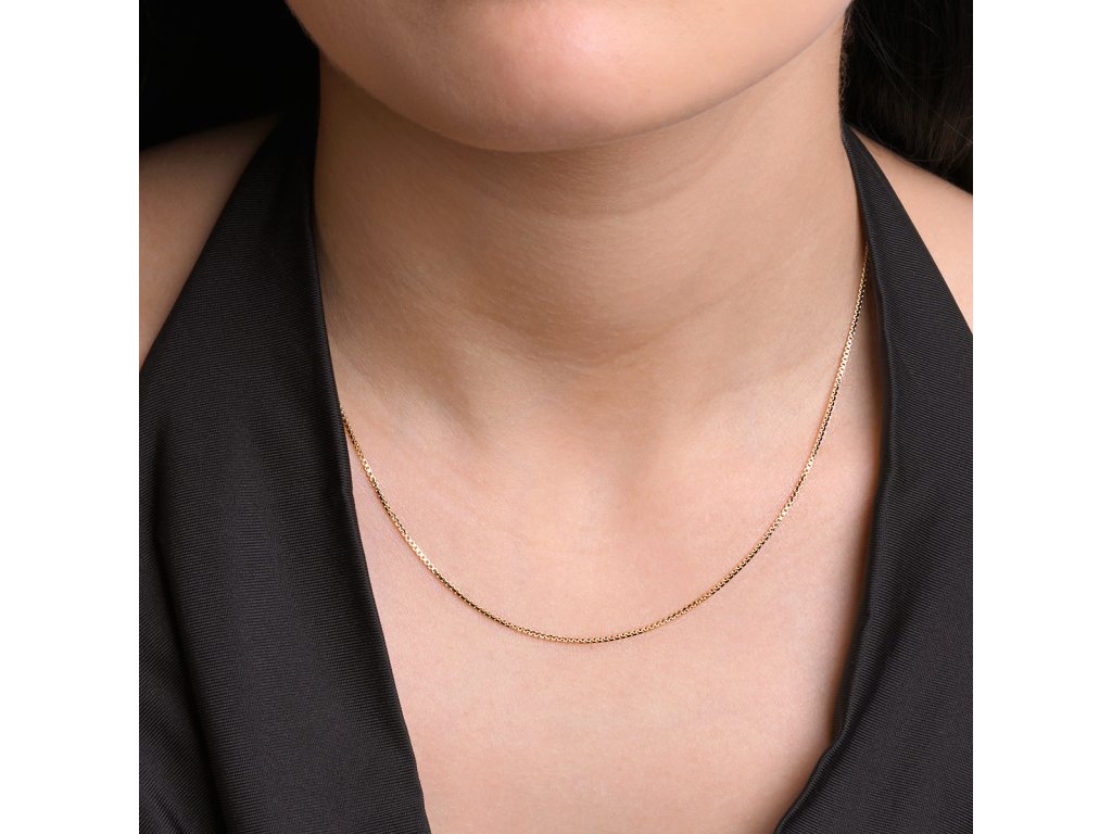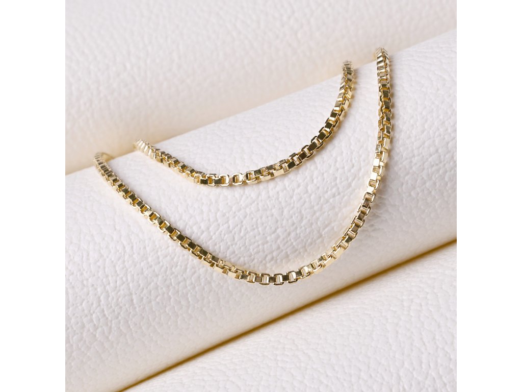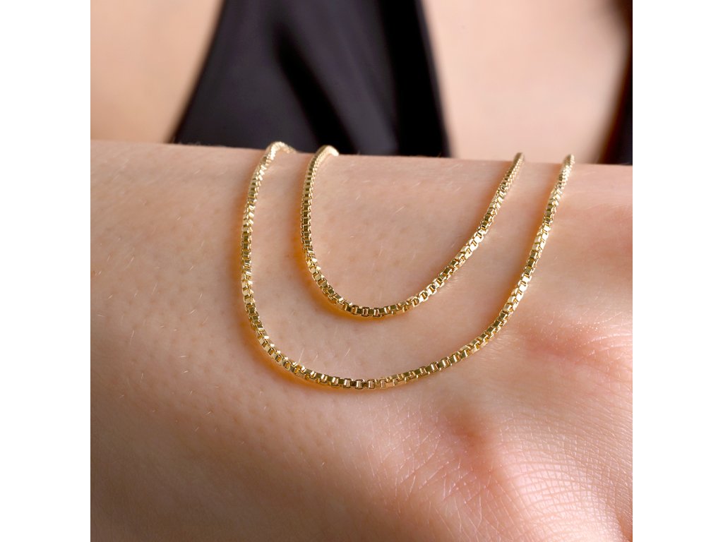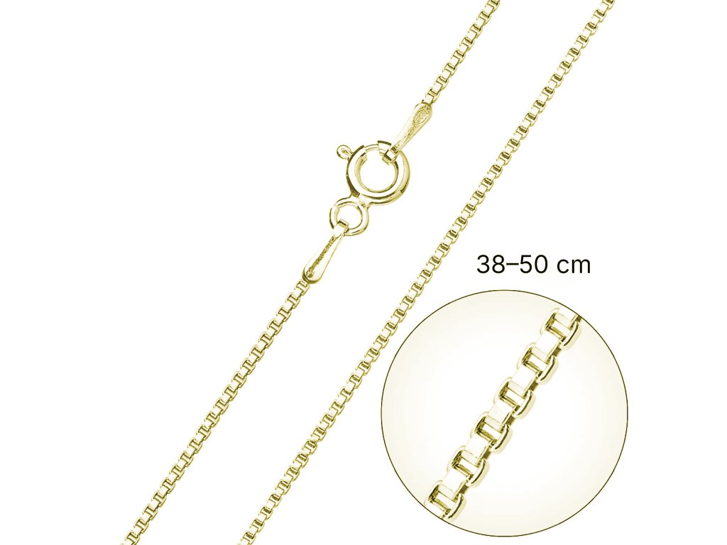 Pozlacený stříbrný řetízek 30014 je vyroben ze stříbra ryzosti 925/1000 včetně povrchového zlacení. Je kostičkového tvaru a nabízíme jej v těchto délkách: 38 cm, 42 cm, 45 cm, 50 cm, průměr řetízku je 1,05 mm.