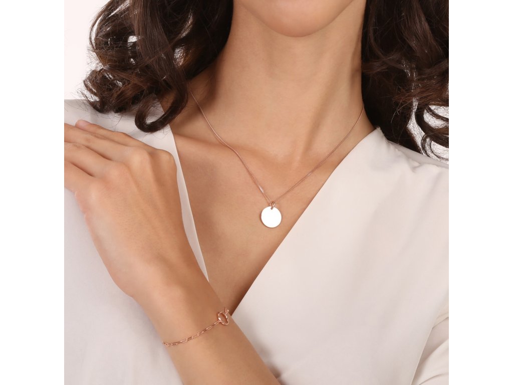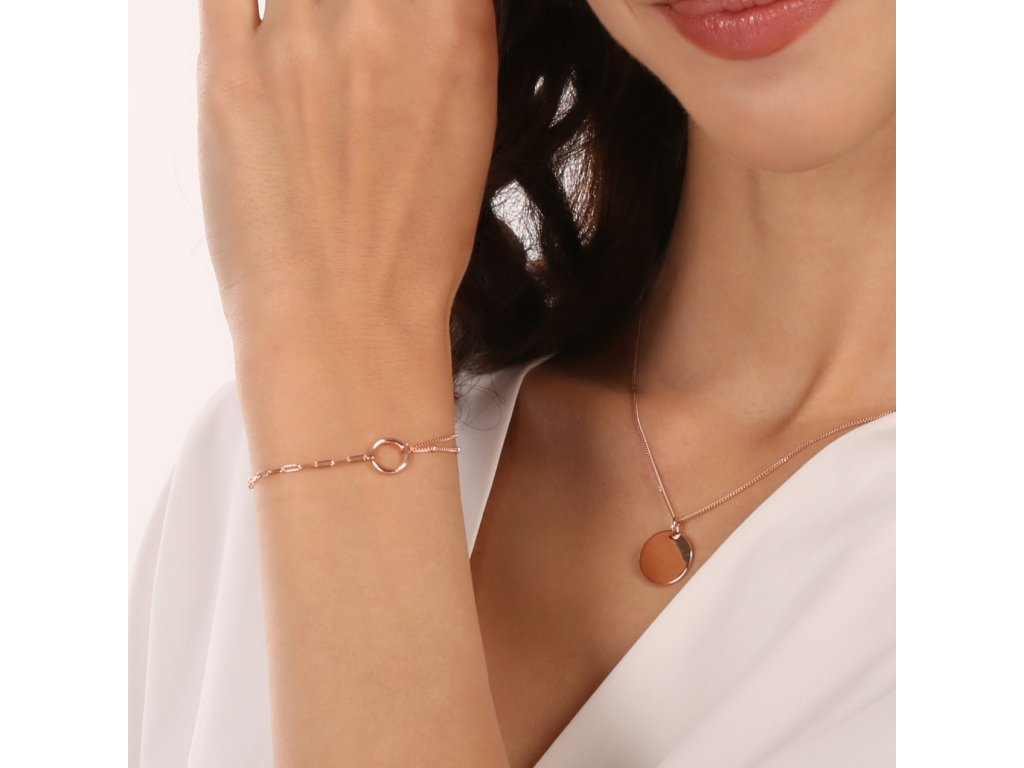 Velmi něžně působící vrstvený náramek ve tvaru kolečka v trendy Rose Gold provedení. Oblíbený dvojitý řetízek z jedné strany a řetízek s většími oky ze strany druhé. To vše spojené moderním symbolem kruhu.Náramek 63013 je vyrobený ze stříbra ryzosti 925/1000 s povrchovou úpravou, která dodává šperku krásnou růžovou barvu Rose Gold. Jelikož šperk neobsahuji žádný přídavek niklu, mohou je bez obav nosit i alergici.
