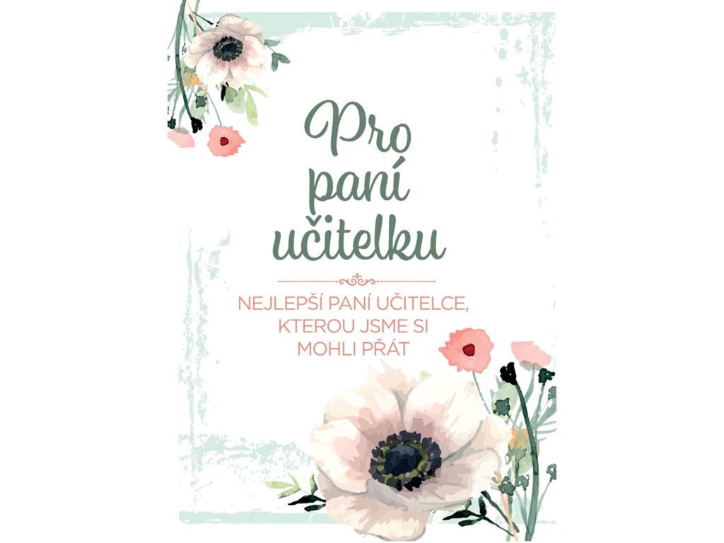 Krásná kartička s květinovým motivem a vřelým textem: „Nejlepší paní učitelce, kterou jsme si mohli přát.“