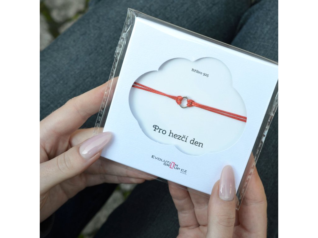 Dárkový set obsahuje moderní červený textilní náramek se stříbrným doplňkem, který je zavěšený na dárkové kartě s nádherným přáním „Pro hezčí den“.