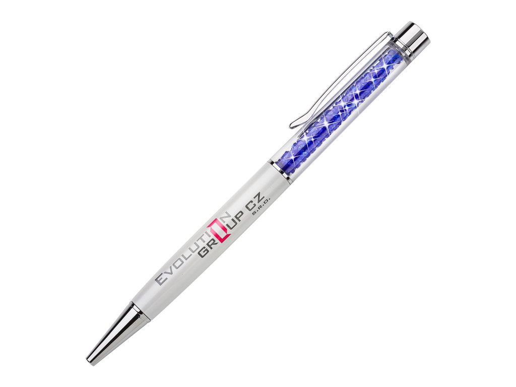 Elegantní propiska zdobená krystaly Swarovski je luxusní psací doplněk, který zaujme svým jedinečným designem. Tělo propisky je vyrobeno z kvalitního materiálu, často kovového nebo akrylového a je zdobeno velkým množstvím modrých krystalů Swarovski, které se třpytí na světle.