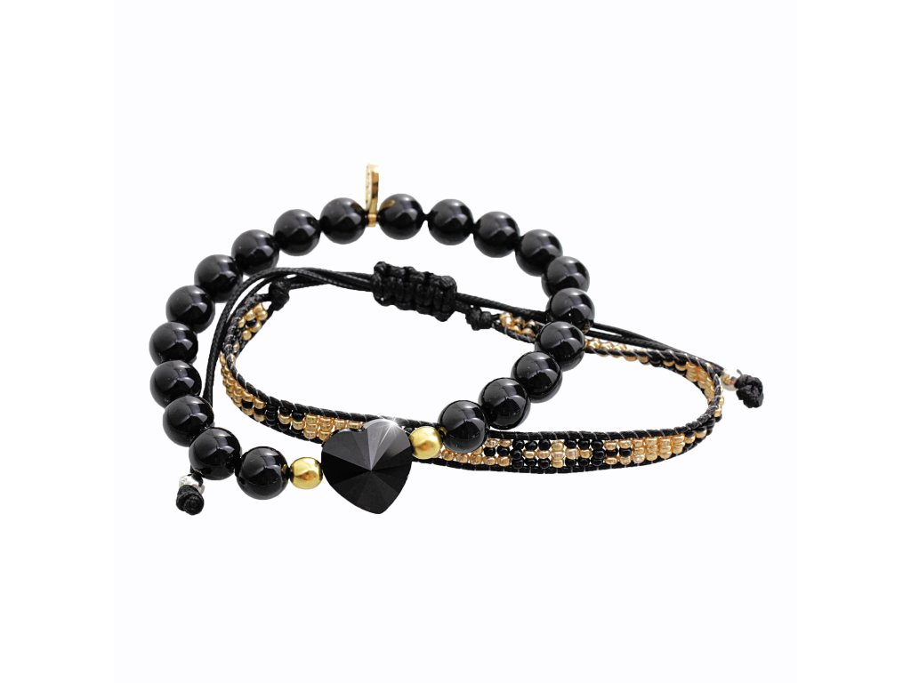 Sada náramků jeden pletený z rokajlu druhý návlek z korálků se srdcovým kamenem Gold Jet