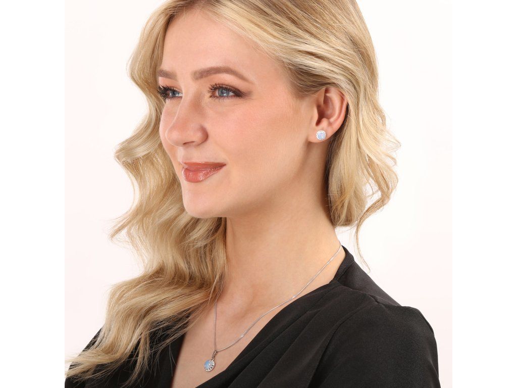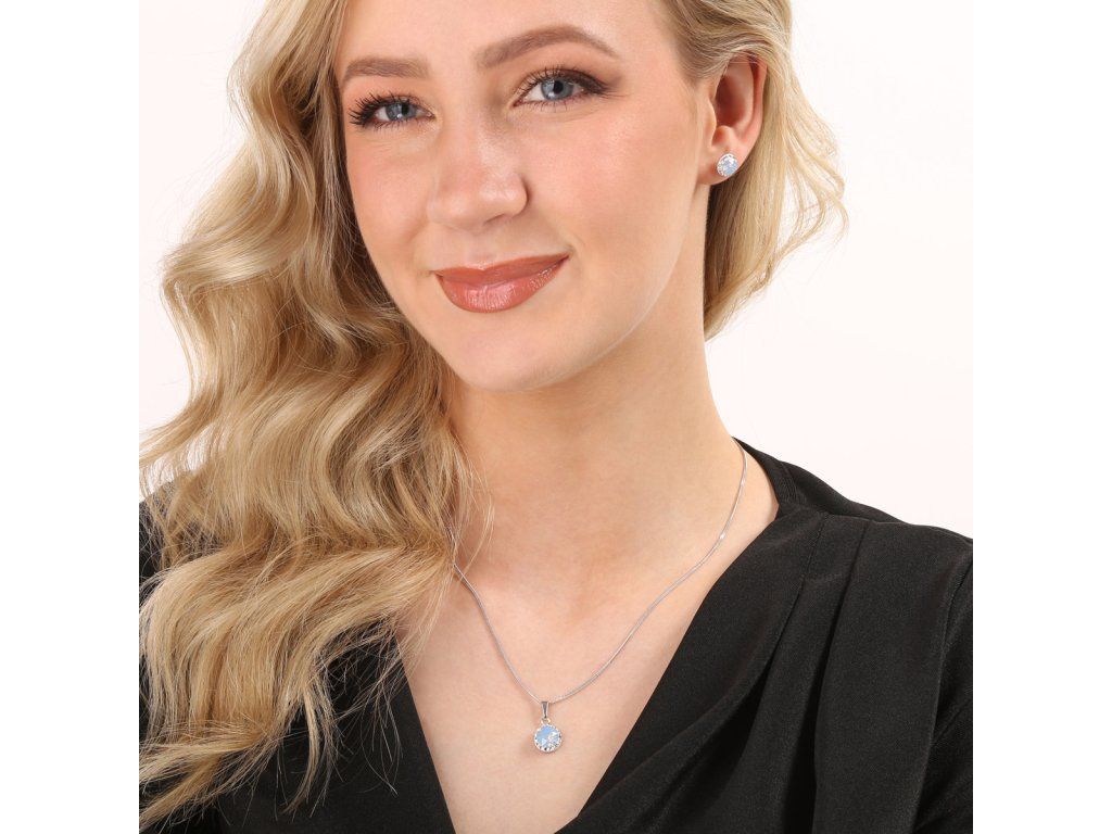 Ozdobte se elegantními a jednoduchými šperky ze soupravy 39352.7, které se hodí k jakémukoliv outfitu.Sada 39352.7 obsahuje náušnice pecky a řetízek s přívěskem. Šperky jsou vyrobeny ze stříbra ryzosti 925/1000, které prošlo povrchovou úpravou rhodiem. Rhodium chrání šperk proti zčernání, zežloutnutí i poškrábání. Přívěšek i náušnice jsou zdobeny kulatým Swarovski krystalem v barvě modrého opálu, který je navíc olemován ještě malými třpytivými Swarovski krystalky v bílé barvě. Náušnice mají zapínání na spolehlivý balónek. Jelikož šperky neobsahuji žádný přídavek niklu, mohou je bez obav nosit i alergici.