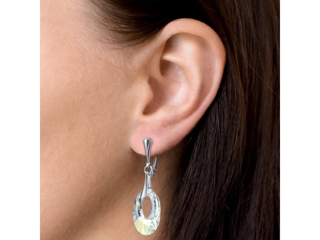 přívěsek ve tvaru oválných kroužků. Šperky jsou vyrobeny ze stříbra ryzosti 925/1000, které prošlo povrchovou úpravou rhodiem. Rhodium chrání šperk proti zčernání, zežloutnutí i poškrábání. Přívěšek i náušnice jsou zdobeny Swarovski krystaly v bílé barvě s AB efektem. Náušnice mají zapínání na klapku. Jelikož šperky neobsahuji