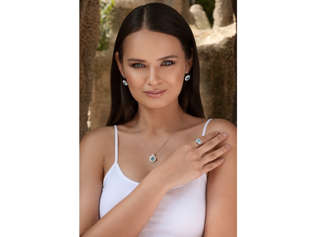 Ozdobte se nádherně zdobenými visacími náušnicemi a přívěskem ve stejném designu ze soupravy 39107.3.Sada šperků 39107.3 obsahuje kulaté visací náušnice a přívěšek ve stejné podobě. Šperky jsou zdobeny velkým kulatým Swarovski krystalem v tyrkysové barvě, který je navíc lemován dvěma řadami menších bílých krystalků Swarovski. Šperky ze soupravy 39107.3 jsou vyrobeny ze stříbra ryzosti 925/1000 včetně povrchové úpravy rhodiem. Rhodium chrání šperk proti zčernání, zežloutnutí i poškrábání. Náušnice mají zapínání na klapku. Jelikož šperky neobsahuji žádný přídavek niklu, mohou je bez obav nosit i alergici.