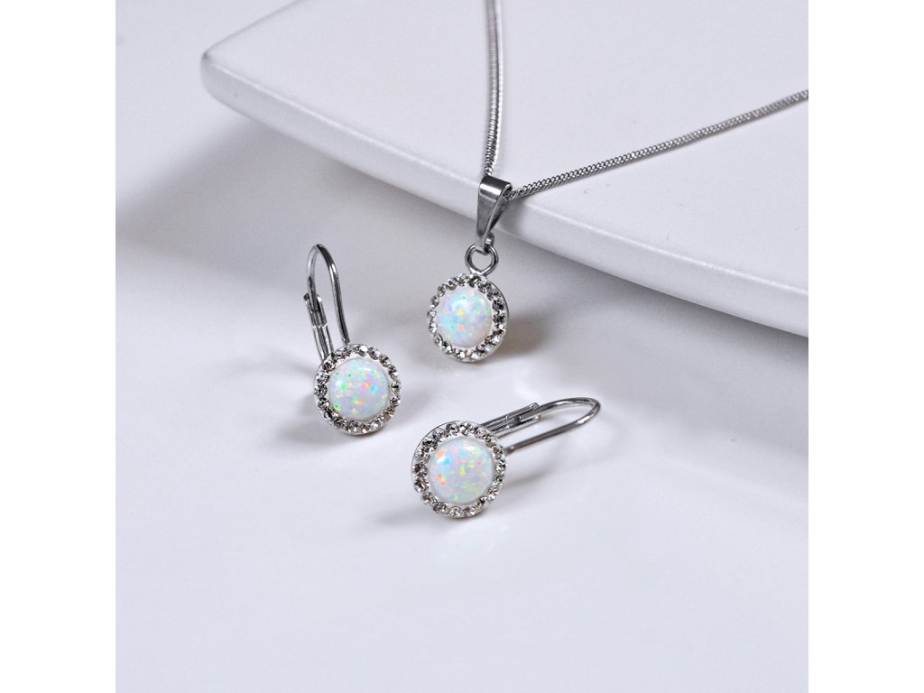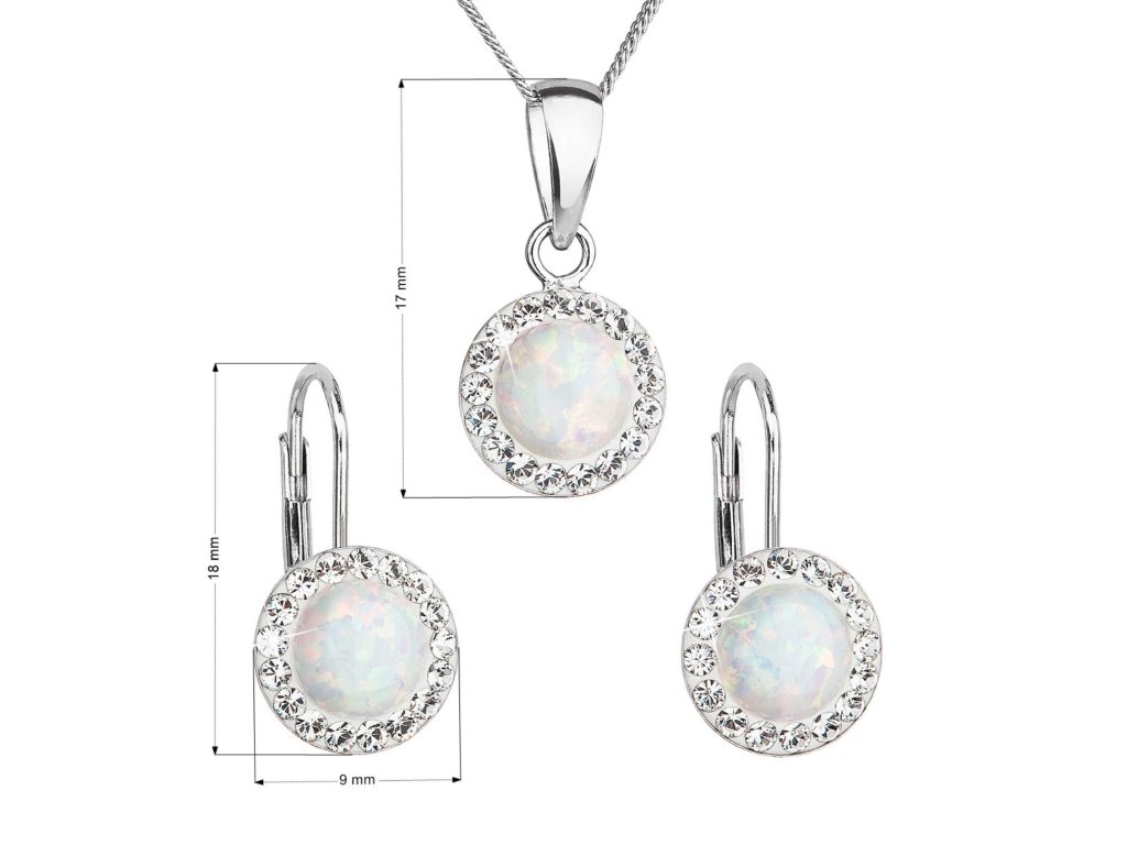 Sada 39160.1 obsahuje visací náušnice a řetízek s přívěskem. Šperky jsou vyrobeny ze stříbra ryzosti 925/1000, které prošlo povrchovou úpravou rhodiem. Rhodium chrání šperk proti zčernání, zežloutnutí i poškrábání. Přívěšek i náušnice jsou zdobeny bílým syntetickým opálem, který je navíc olemován malými třpytivými Preciosa krystaly v bílé barvě. Náušnice mají zapínání na klapku. Jelikož šperky neobsahuji žádný přídavek niklu, mohou je bez obav nosit i alergici.