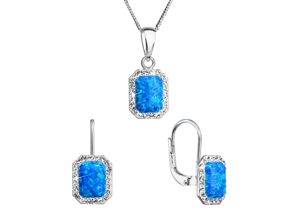 Přívěšek i náušnice jsou zdobeny hranatým modrým syntetickým opálem, který je navíc olemován ještě malými extra třpytivými Preciosa krystalky v bílé barvě.