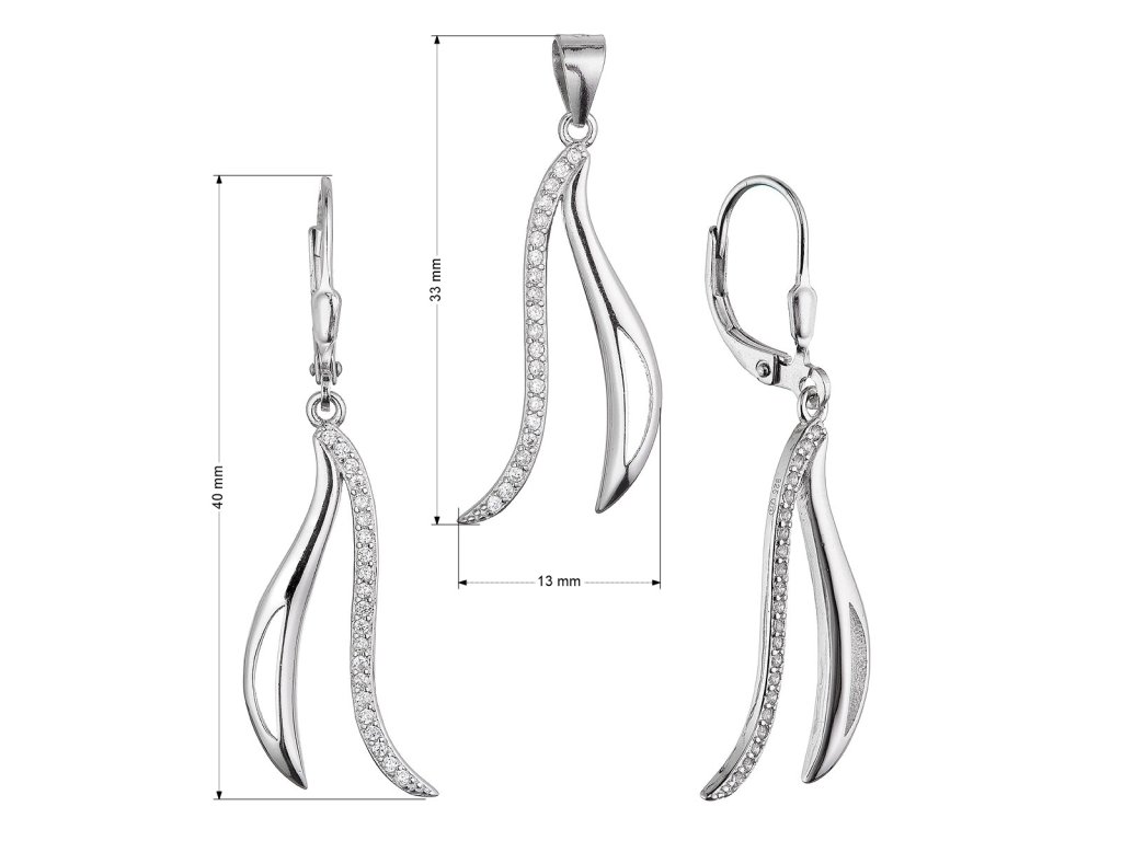 Přívěšek i náušnice jsou osázené třpytivými bílými zirkony. Náušnice mají zapínání na klapku. Šperk neobsahuje nikl, a tak je vhodný pro citlivé osoby i pro alergiky.