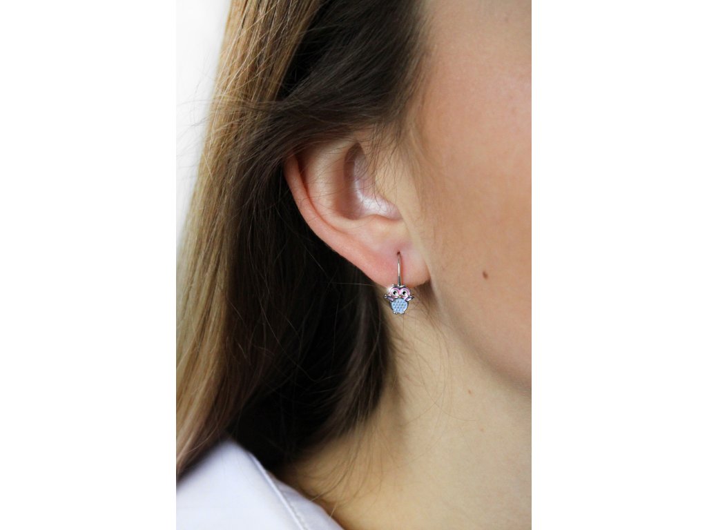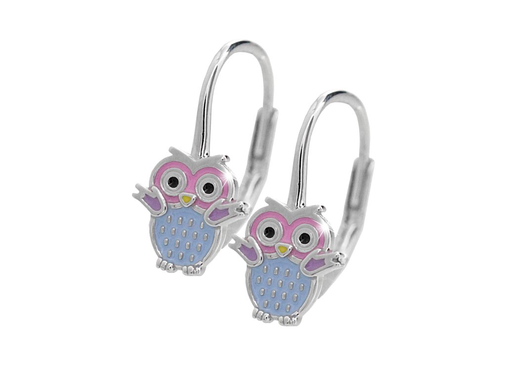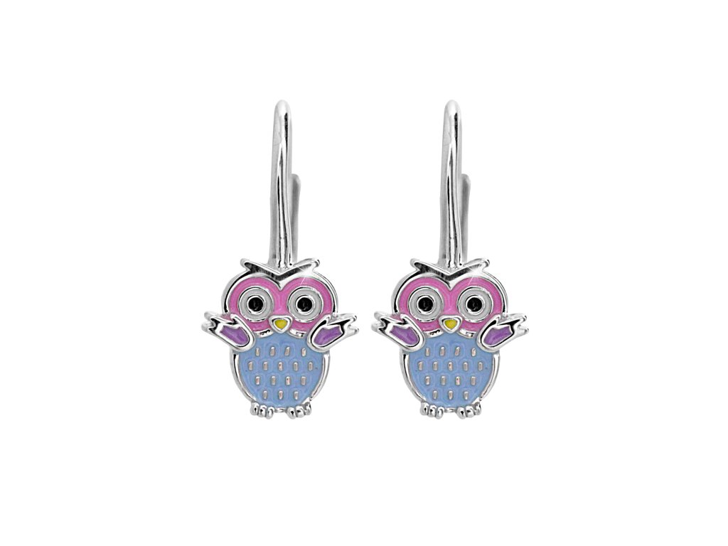 Stříbrné dětské náušnice klapky sova s barevným smaltem (Stříbro 925/1000)