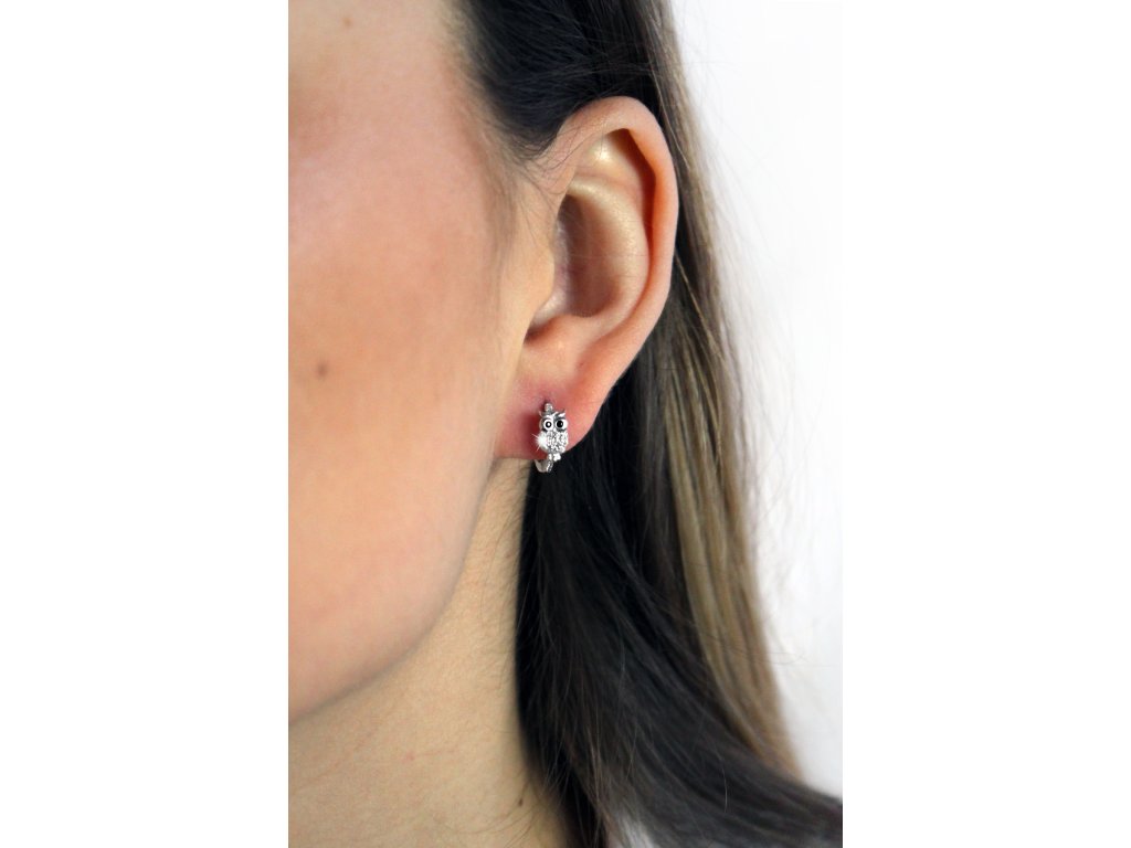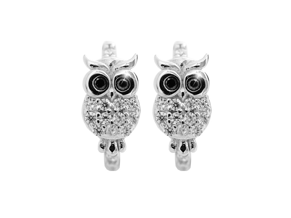 Stříbrné dětské náušnice kroužky sovička s Kubickými zirkony Crystal (Stříbro 925/1000)