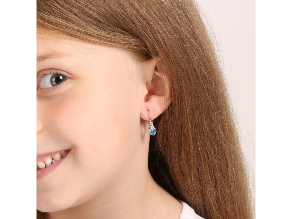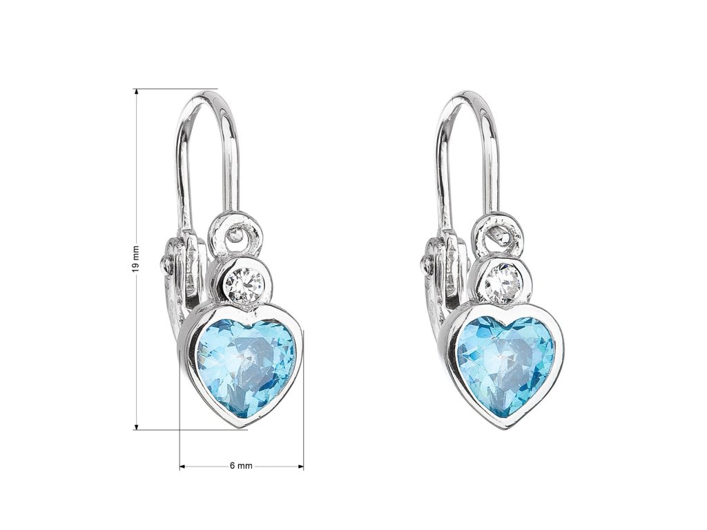 Náušnice visací se srdcem jsou vyrobeny ze stříbra ryzosti 925/1000, jehož povrch je upraven rhodiem. Rhodium šperk chrání proti zčernání, zežloutnutí nebo poškrábání, což je u dětí velká výhoda. Náušnice zdobí modrý zirkon ve tvaru srdce a jeden menší bílý kulatý zirkon.