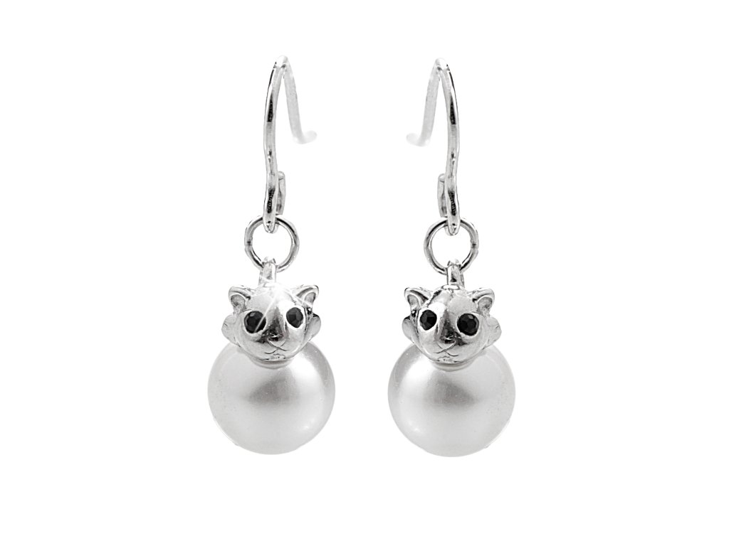 Stříbrné náušnice háčky ve tvaru kočky ozdobené bílou perlou (Stříbro 925/1000)