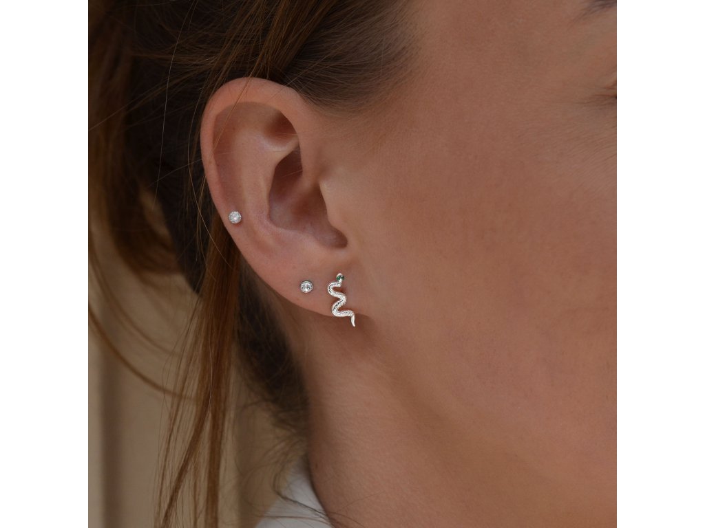 Objevte jedinečný šperk, který zaujme na první pohled – stříbrné náušnice ve tvaru hada. Jsou vyrobeny ze stříbra o ryzosti 925/1000 s rhodiovou úpravou a jejich precizní zpracování zvýrazňuje elegantní křivky hadí siluety. Dominantním prvkem jsou dva zelené zirkony zasazené v místech očí, které dodávají náušnicím výrazný a tajemný pohled.