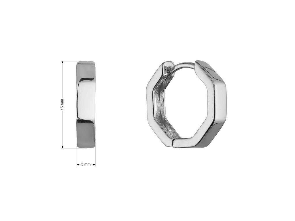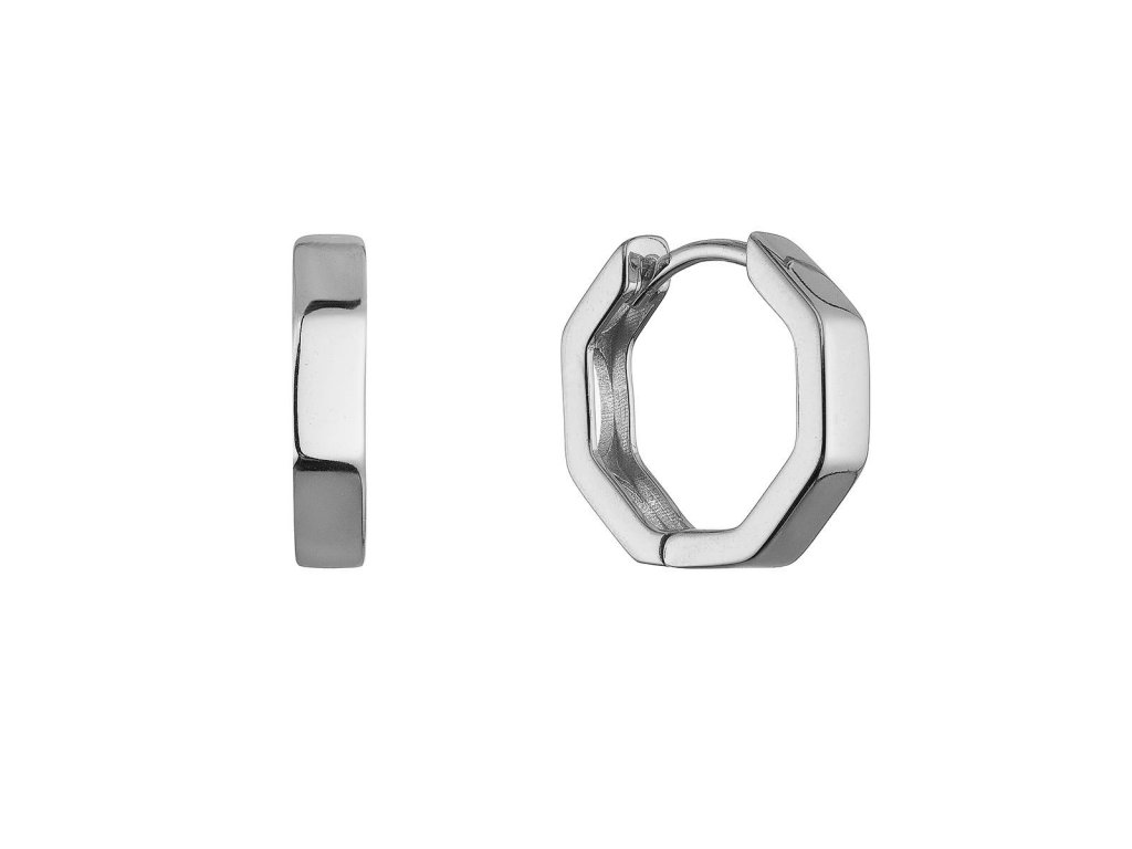 Tyto stříbrné kruhové náušnice vás zaujmou na první pohled svým neobvyklým tvarem. Nejde o klasické kulaté kruhy – jejich design je jemně hranatý, zaoblený do měkkých linií, které dodávají moderní a sofistikovaný vzhled. Hladký povrch bez zdobení nechává vyniknout tvar i lesk kovu.