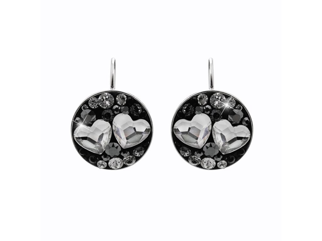 Stříbrné náušnice klapky kulaté s krystaly ve tvaru srdcí Swarovski Jet (Stříbro 925/1000)