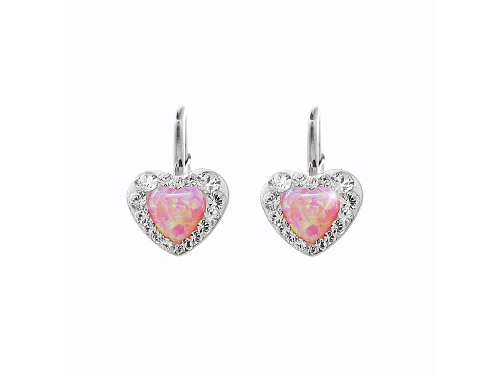Stříbrné náušnice klapky s opálovým srdíčkem Rose a krystaly Swarovski Crystal po obvodu (Stříbro 925/1000)