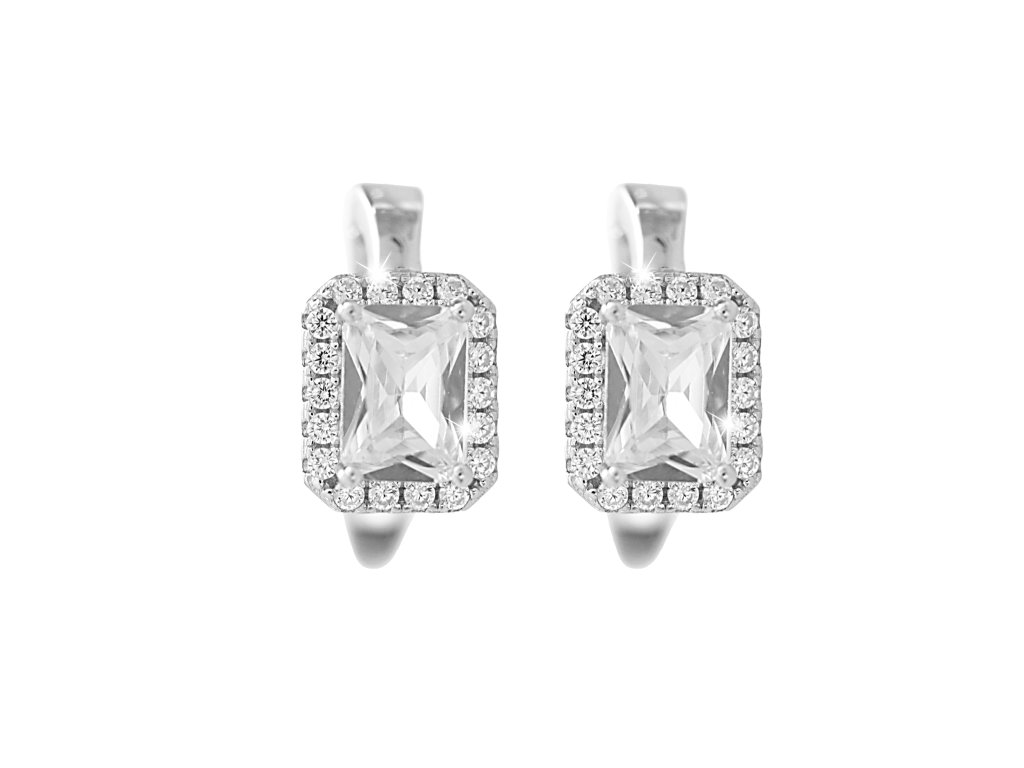 Stříbrné náušnice klapky velký obdélníkový zirkon a drobné Kubické zirkony kolem něj Crystal (Stříbro 925/1000)