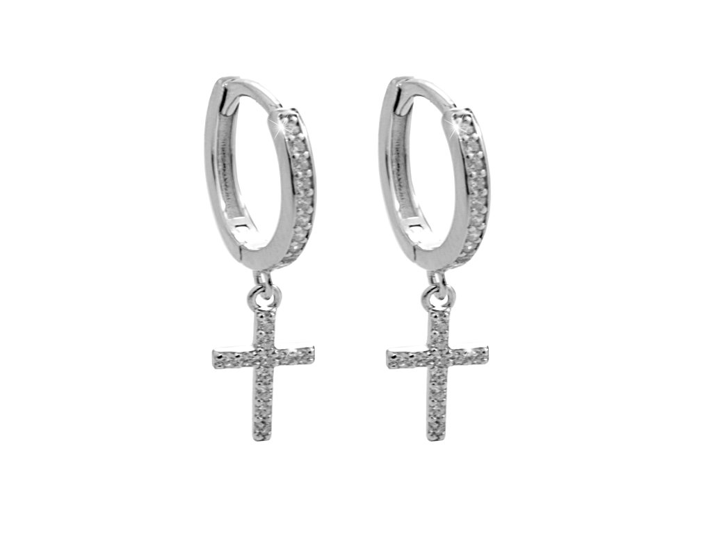 Stříbrné náušnice kreole s Kubickými zirkony a s přívěskem křížku (Stříbro 925/1000)