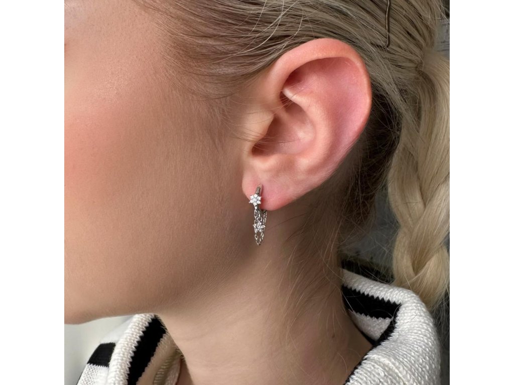 Náušnice ve tvaru malých kroužků jsou zdobeny zavěšeným řetízkem a kytičkami vykládanými třpytivými zirkony. Šperk je vyroben z rhodiovaného stříbra o ryzosti 925/1000. Rhodium chrání šperk proti černání, žloutnutí i poškrábání. Náušnice neobsahují nikl, a tak jej mohou nosit i alergici.