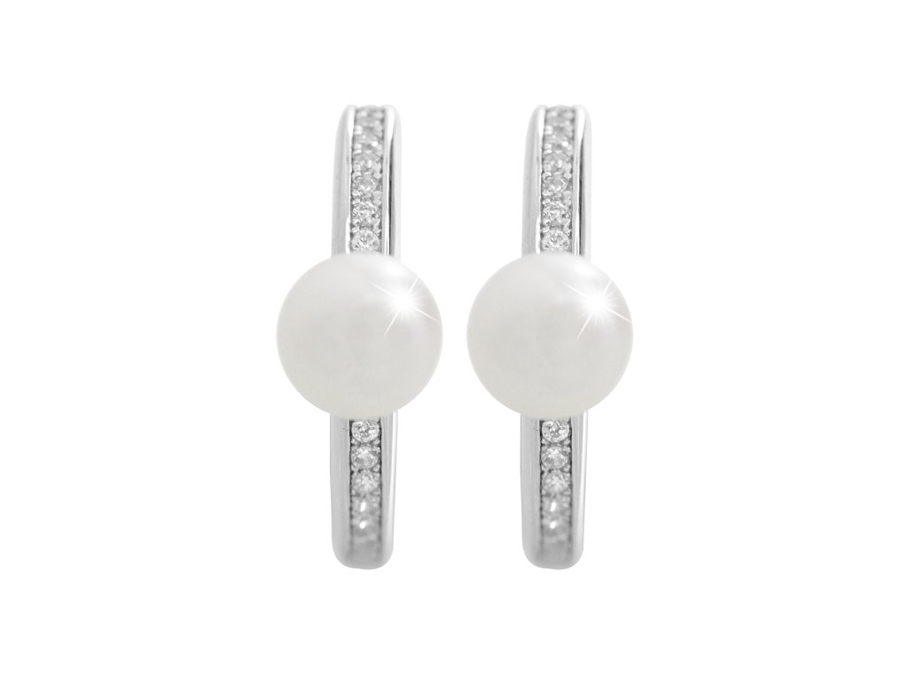 Stříbrné náušnice kruhy s říční perlou a Kubickými zirkony Crystal (Stříbro 925/1000)