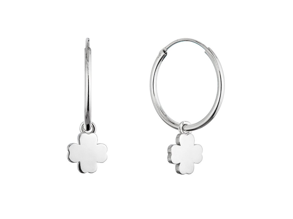 Tyto kruhové stříbrné náušnice s přívěskem ve tvaru čtyřlístku jsou elegantním a zároveň hravým doplňkem. Čtyřlístek je symbol štěstí a štěstí přinese i těm, kdo je nosí.