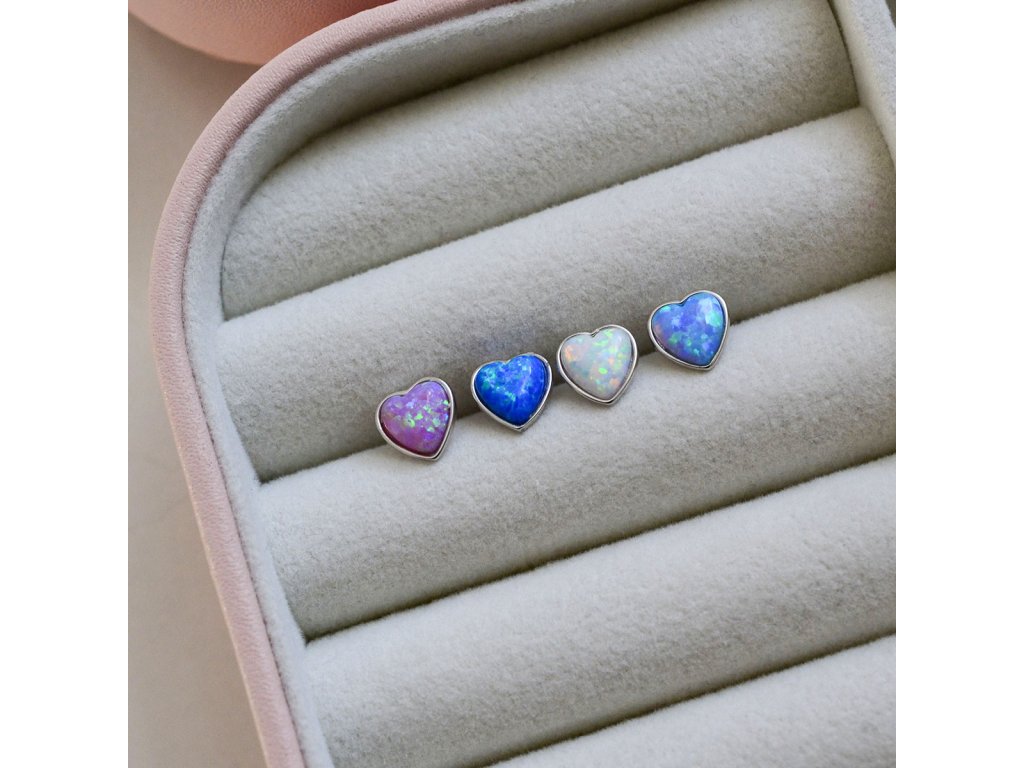 Stříbrné náušnice pecky, malá jemná srdíčka se syntetickým opálem.Náušnice srdíčkové pecky tvoříme ze stříbra ryzosti 925/1000, které je upraveno rhodiem. Díky rhodiu je šperk odolný proti zčernání, zežloutnutí nebo poškrábání. Náušnice tvoří jeden syntetický opál ve tvaru srdce a v modré barvě.