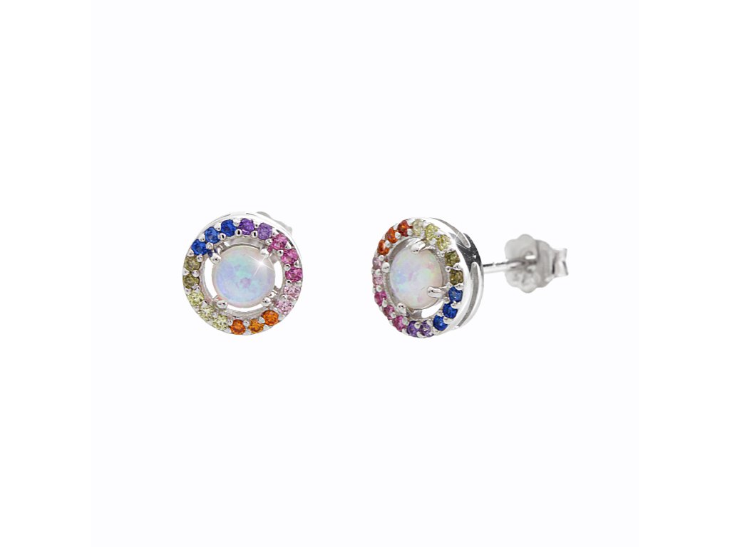 Stříbrné náušnice puzety kulaté s opálem a Kubickými zirkony po obvodu Multi (Stříbro 925/1000)