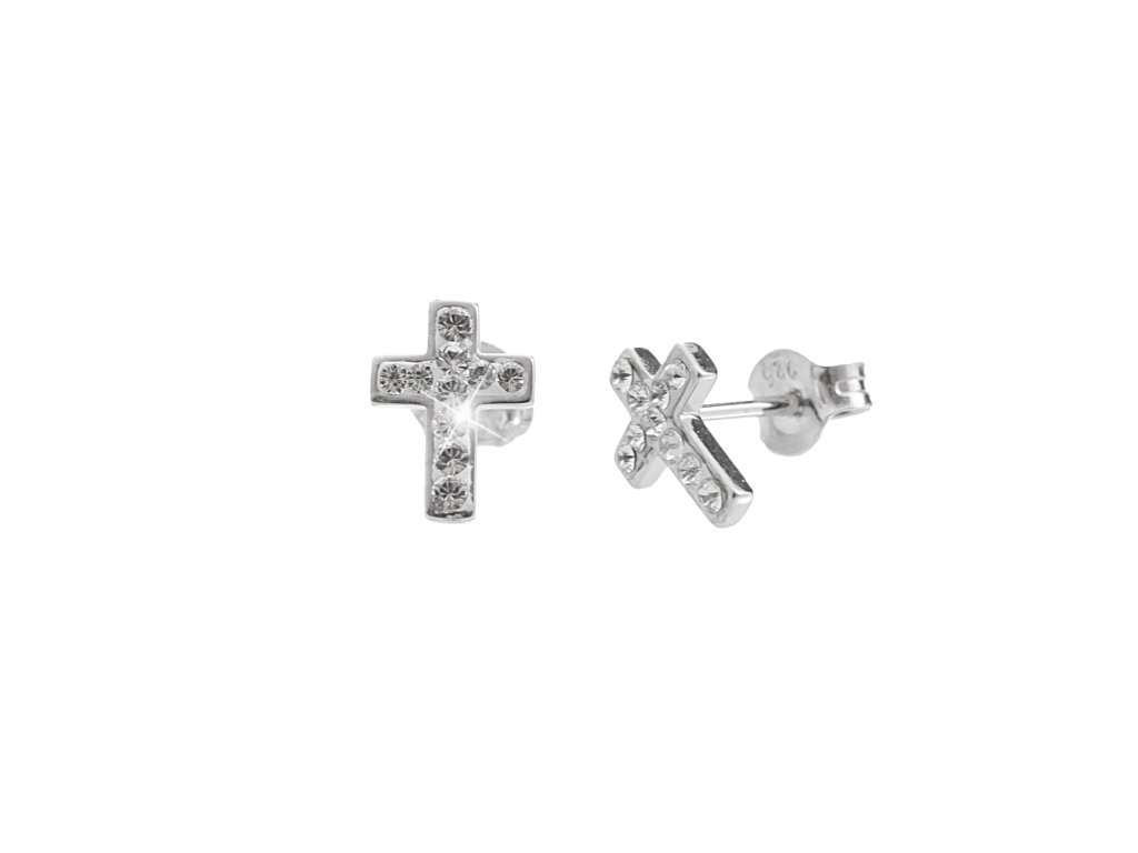 Stříbrné náušnice puzety malý křížek zdobené krystaly Swarovski Crystal (Stříbro 925/1000)