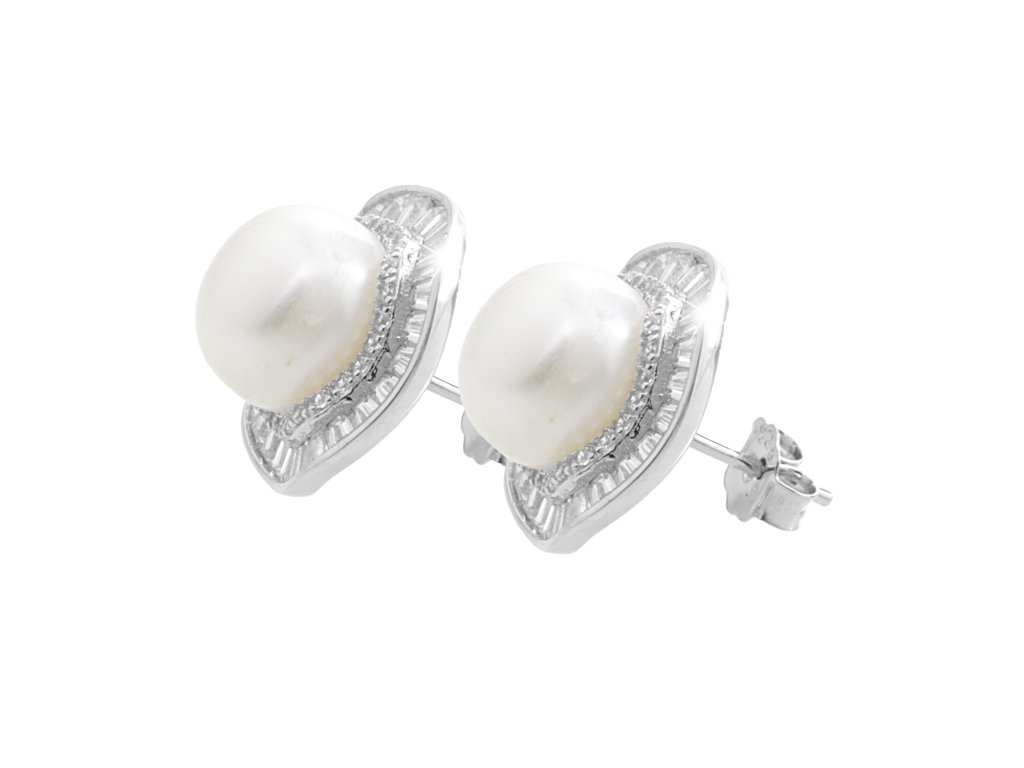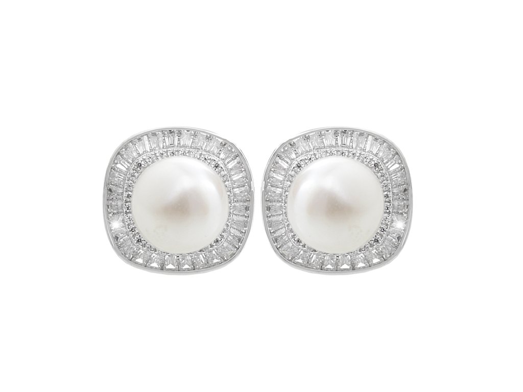 Stříbrné náušnice puzety s říční perlou kolem které jsou obdélníkové krystaly Swarovski Crystal (Stříbro 925/1000)