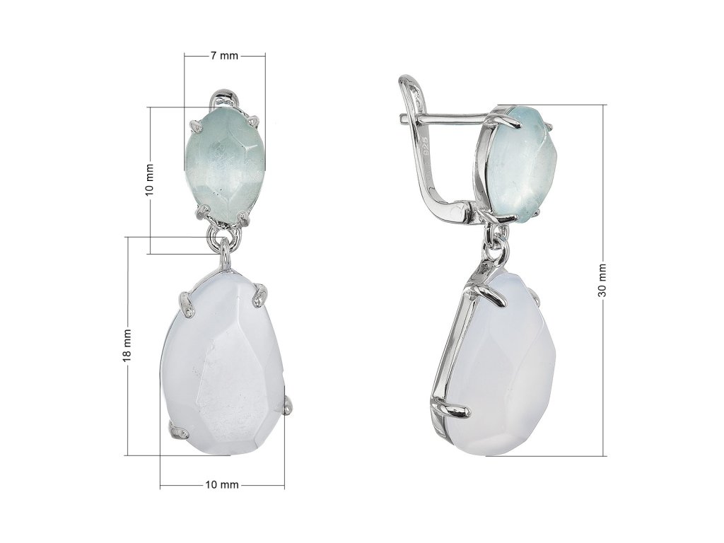 Náušnice jsou vyrobeny z ryzího stříbra té nejvyšší kvality 925/1000, dokonale chráněného rhodiovou úpravou. Rhodiový povrch nejen chrání šperk před oxidací, ale zajišťuje také jeho nepřekonatelný lesk a odolnost proti poškrábání. Náušnice zdobí dva vzácné kameny v nádherném, téměř sochařském provedení - větší, něžně modrošedý chalcedon a menší, zářivý akvamarín. Jejich nepravidelný, surový tvar připomínající přírodní kameny v sobě ukrývá dramatický příběh země a oceánu. Kameny jsou umístěny vertikálně nad sebou a vytvářejí tak dynamickou kompozici. Pohodlné zapínání na ruský patent zaručuje spolehlivé a bezpečné nošení.