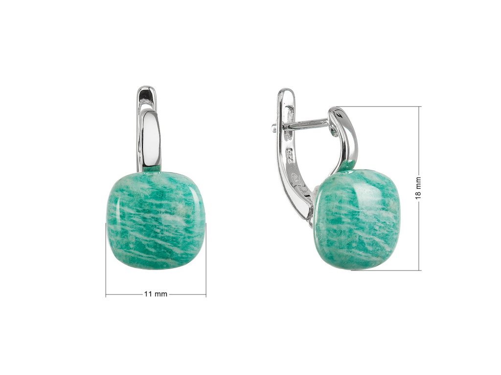 Náušnice jsou vyrobeny ze stříbra ryzosti 925/1000 s rhodiovou povrchovou úpravou, která chrání šperk proti poškrábání a zčernání. Pravý amazonit ve svěží zelené barvě, jímž jsou náušnice zdobeny, zachycuje svěžest a klid přírody. Visací tvar náušnic podtrhuje jejich lehkost a dynamiku. Zapínání na ruský patent pak zajišťuje pohodlné a spolehlivé nošení.