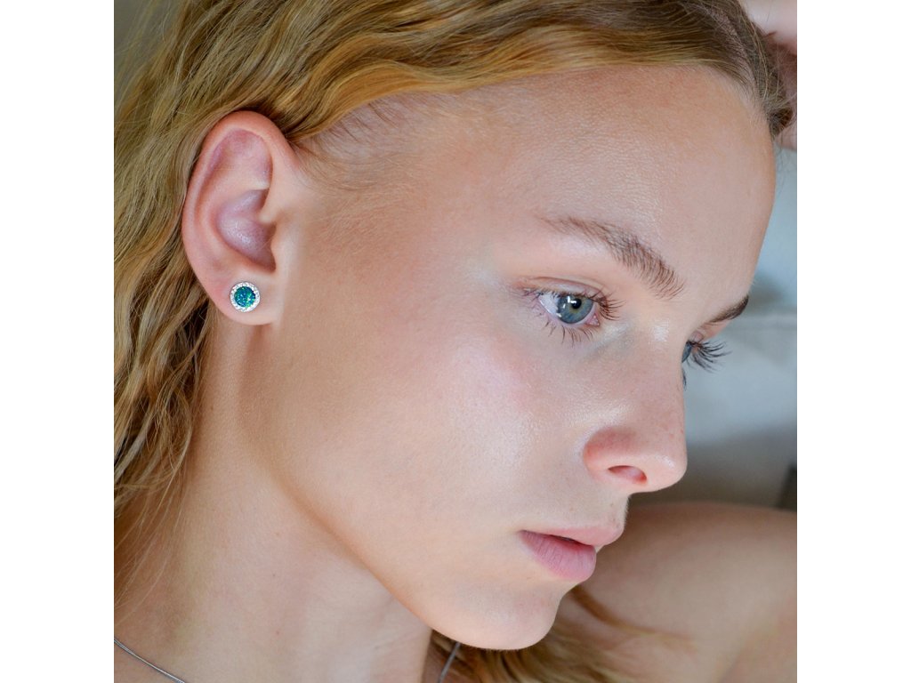 Šperk v barvách přírody, které připomínají lesní ticho i svěží jarní trávu. Tyto stříbrné náušnice typu pecky zdobí kulatý syntetický opál, jenž se na světle duhově rozzáří v různých tónech zelené – od jemně mátové po hlubší smaragdové. Jemné odlesky dodávají kameni proměnlivou krásu, kterou doplňují drobné čiré krystaly Preciosa zasazené kolem středu.