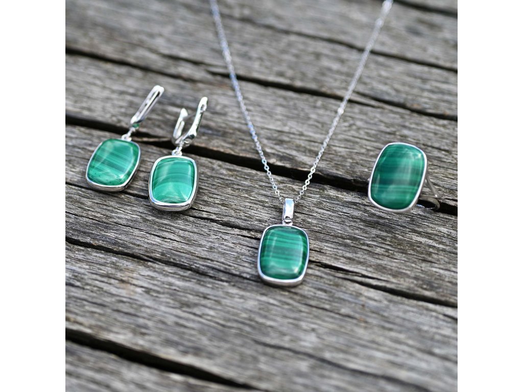 Visací náušnice jsou vyrobeny z ryzího stříbra té nejvyšší kvality 925/1000, dokonale chráněného luxusní rhodiovou úpravou, která dodává šperku nepřekonatelný lesk a ochranu před oxidací. Zavěšený obdélník je vyplněn vzácným malachitem v sytých, hlubokých odstínech zelené, který v sobě ukrývá mystickou energii přírody. Každý kus tohoto šperku je unikátní - malachit s charakteristickou zelenou kresbou připomíná tajemné krajiny a dechberoucí přírodní scenérie. Pohodlné zapínání na ruský patent zaručuje spolehlivé a bezpečné nošení.