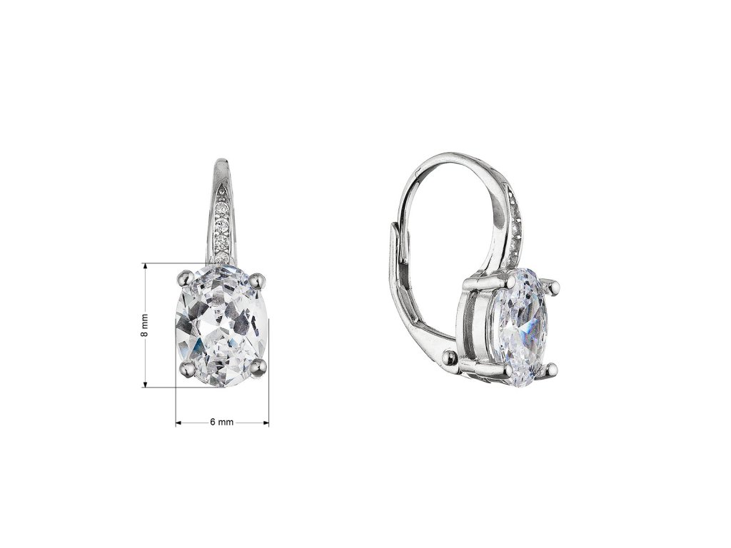 Náušnice mají elegantní oválný tvar, jehož střed zdobí větší oválný čirý zirkon v bílé barvě. Nad tímto dominantním kamenem jsou vsazeny čtyři menší čiré kamínky, které dodávají šperku jemný třpyt a zvýrazňují jeho sofistikovaný vzhled. Zapínání na klapku zajišťuje pohodlné a bezpečné nošení po celý den.
