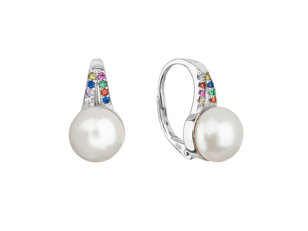 Stříbrné náušnice visací s bílou říční perlou a multi zirkony 21070.3 multi