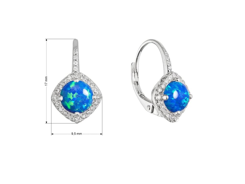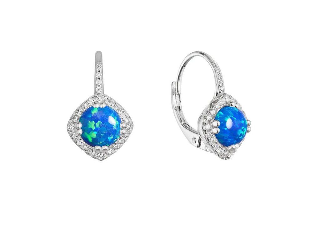 Stříbrné náušnice s modrým kulatým syntetickým opálem bohatě zdobené bílými zirkony zpříjemné každou oslavu i obyčejný den.Visací náušnice vyrábíme ze stříbra ryzosti 925/1000, které je upraveno rhodiem. Díky rhodiu je šperk odolný proti zčernání, zežloutnutí nebo poškrábání. Náušnice tvoří jeden kulatý syntetický opál v modré barvě a kolem opálu jsou do tvaru kosočtverce usazeny bílé zirkony.