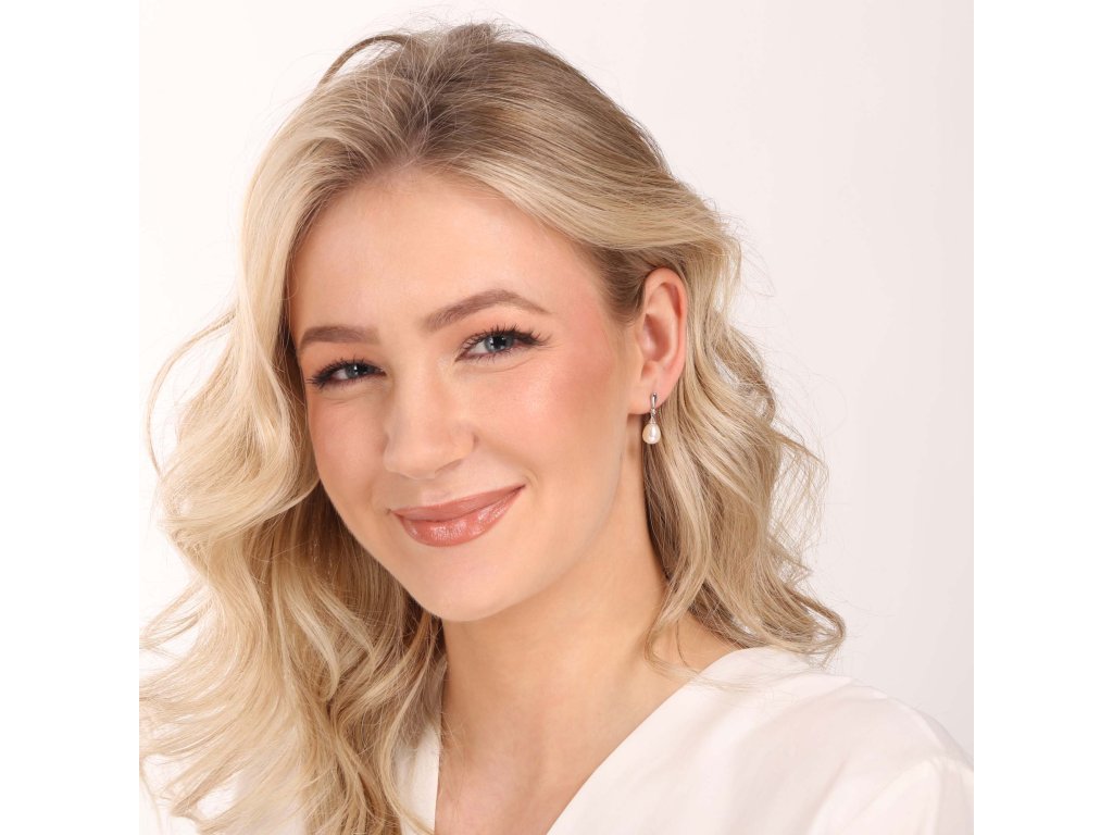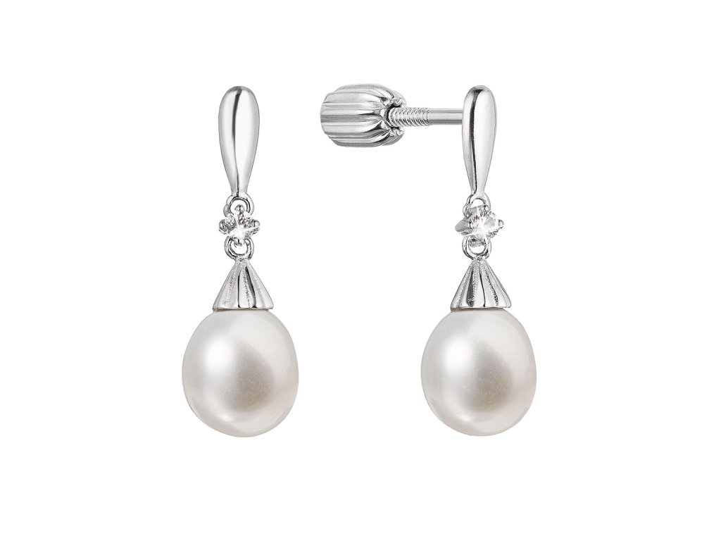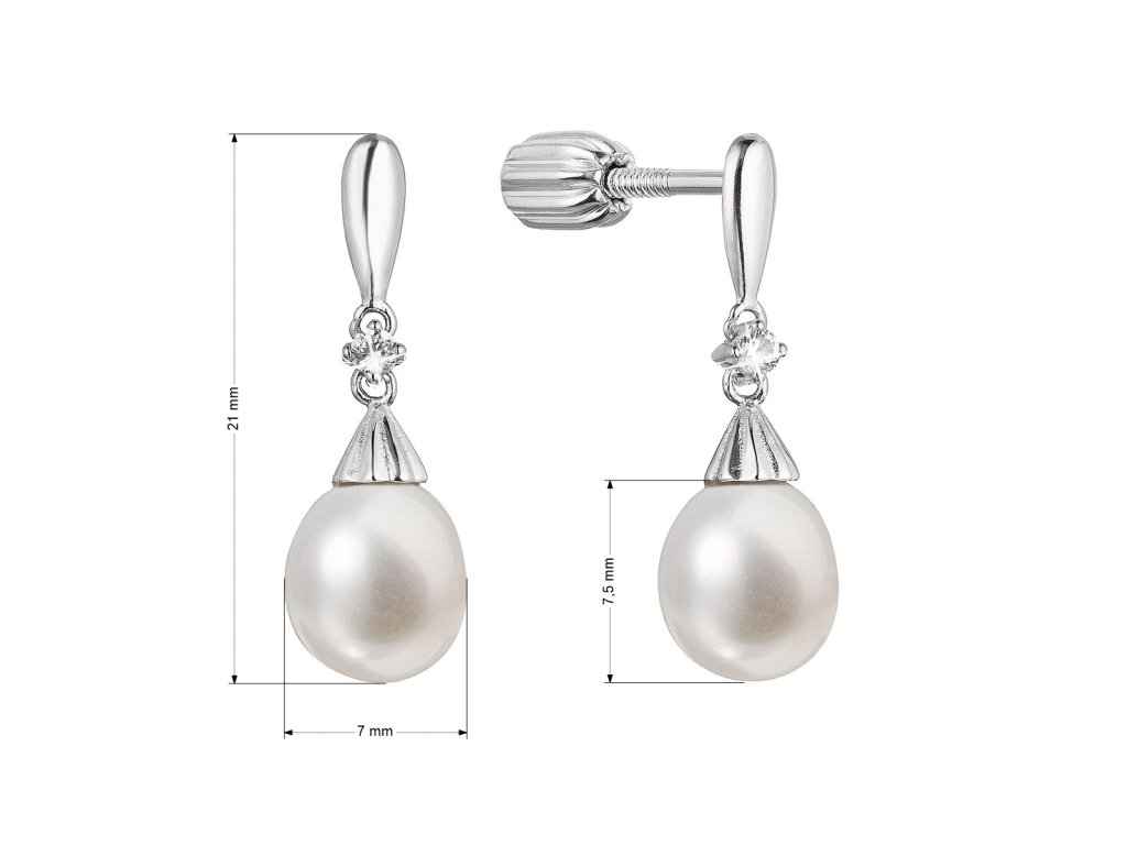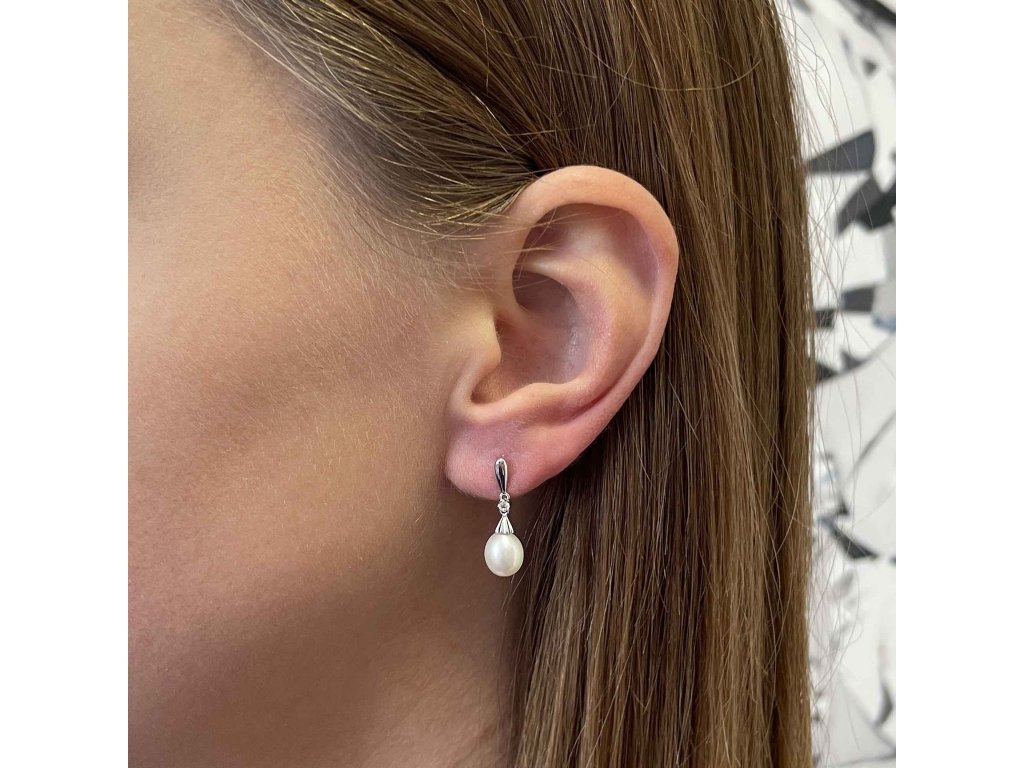 Stříbrné náušnice s visící bílou říční perlou a třpytivým zirkonem jsou okouzlující kombinací.