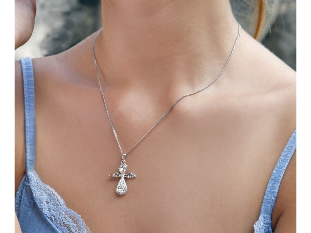 Na řetízku je zavěšen stříbrný přívěšek ve tvaru anděla s křídly, navíc je zdobený bílými Swarovski krystaly.