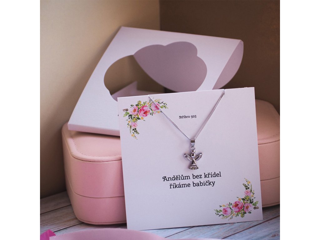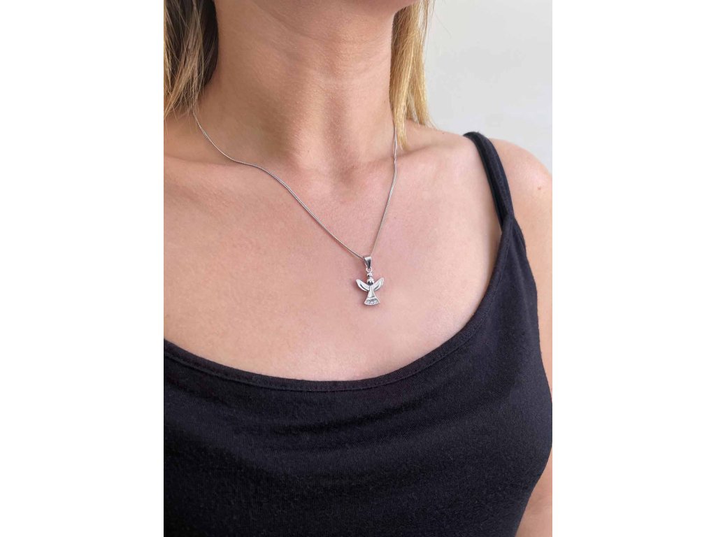 Na řetízku je zavěšen stříbrný přívěšek ve tvaru anděla s křídly, navíc je zdobený bílými Swarovski krystaly.