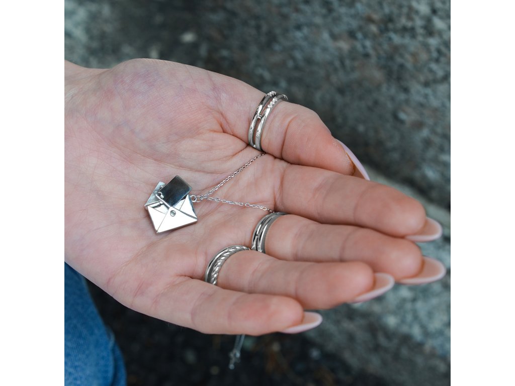 Náhrdelník s otevírací stříbrnou obálkou je kouzelným doplňkem, který ukrývá malé tajemství.