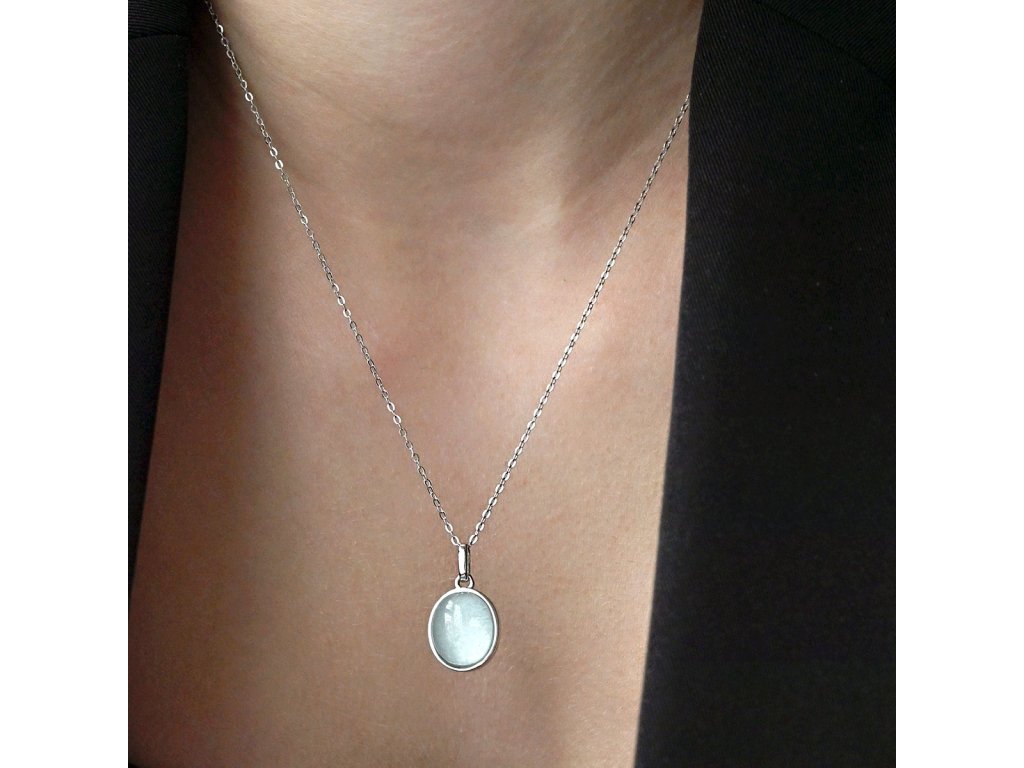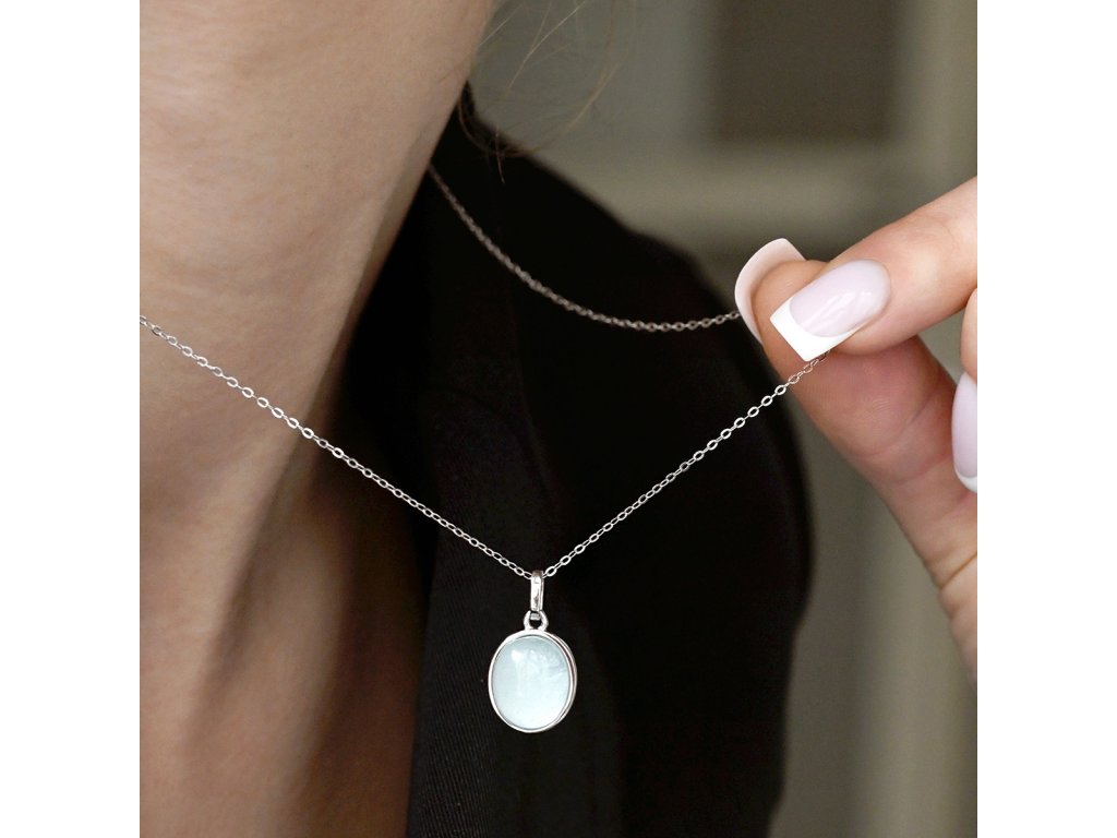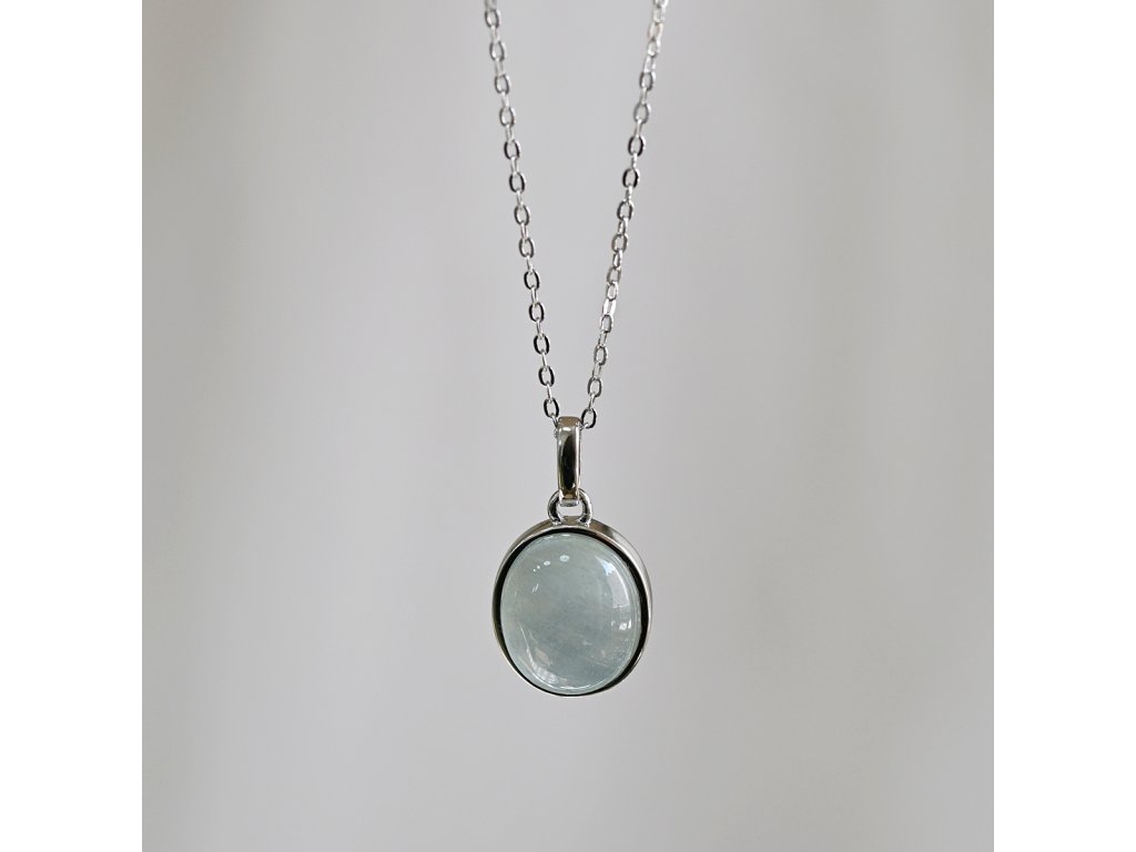 Náhrdelník s přívěskem je vyroben ze stříbra ryzosti 925/1000 s rhodiovou úpravou, která poskytuje šperku maximální ochranu před poškrábáním, zežloutnutím i zčernáním. Precizně zasazený přírodní akvamarín v něžně modré barvě zaplňuje oválný přívěsek a připomíná klidnou hladinu oceánu zachycenou v jediném okamžiku. Jednoduchý design nechává vyniknout přirozené kráse kamene a jeho jemnému barevnému odstínu.