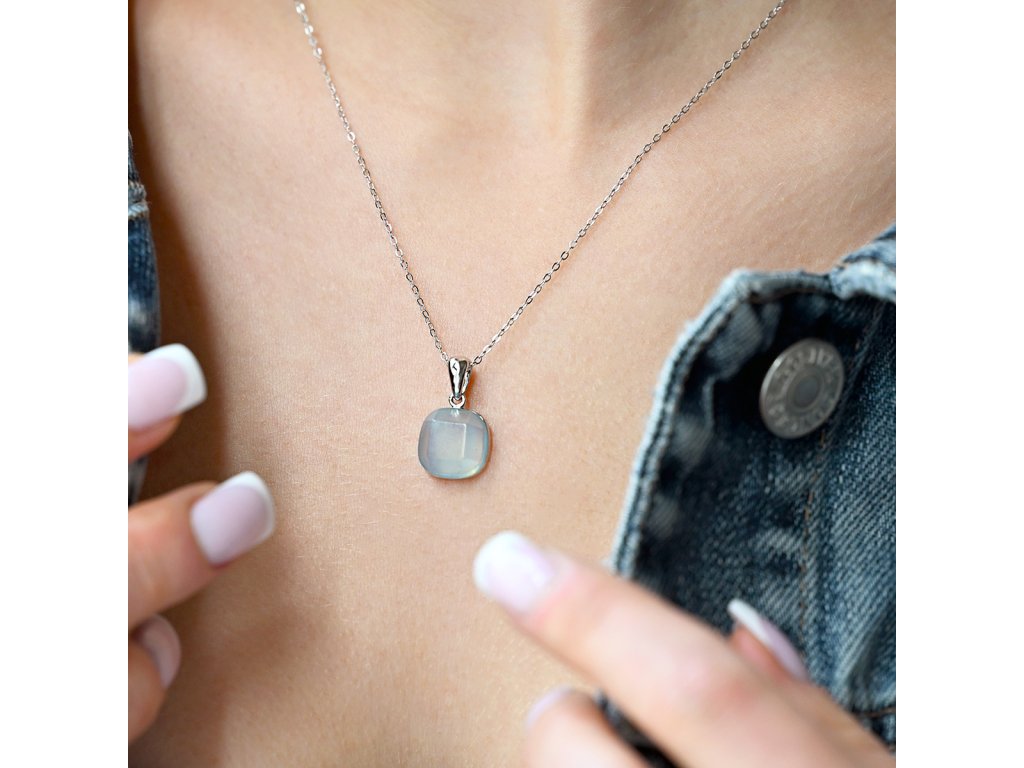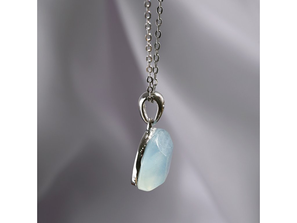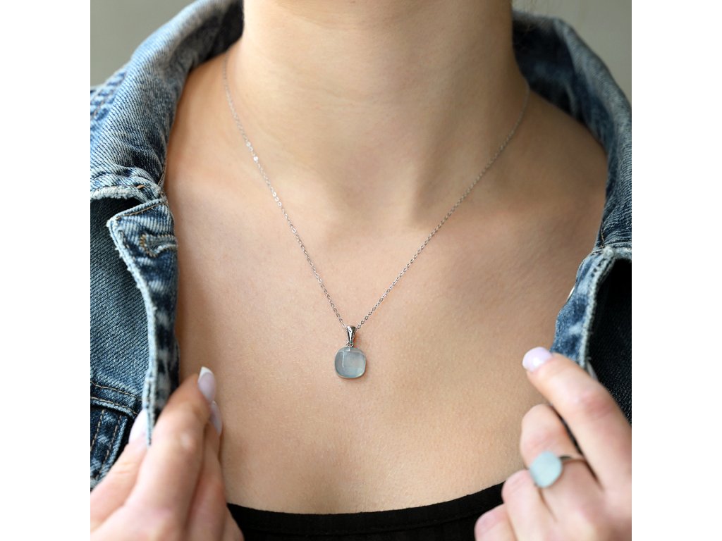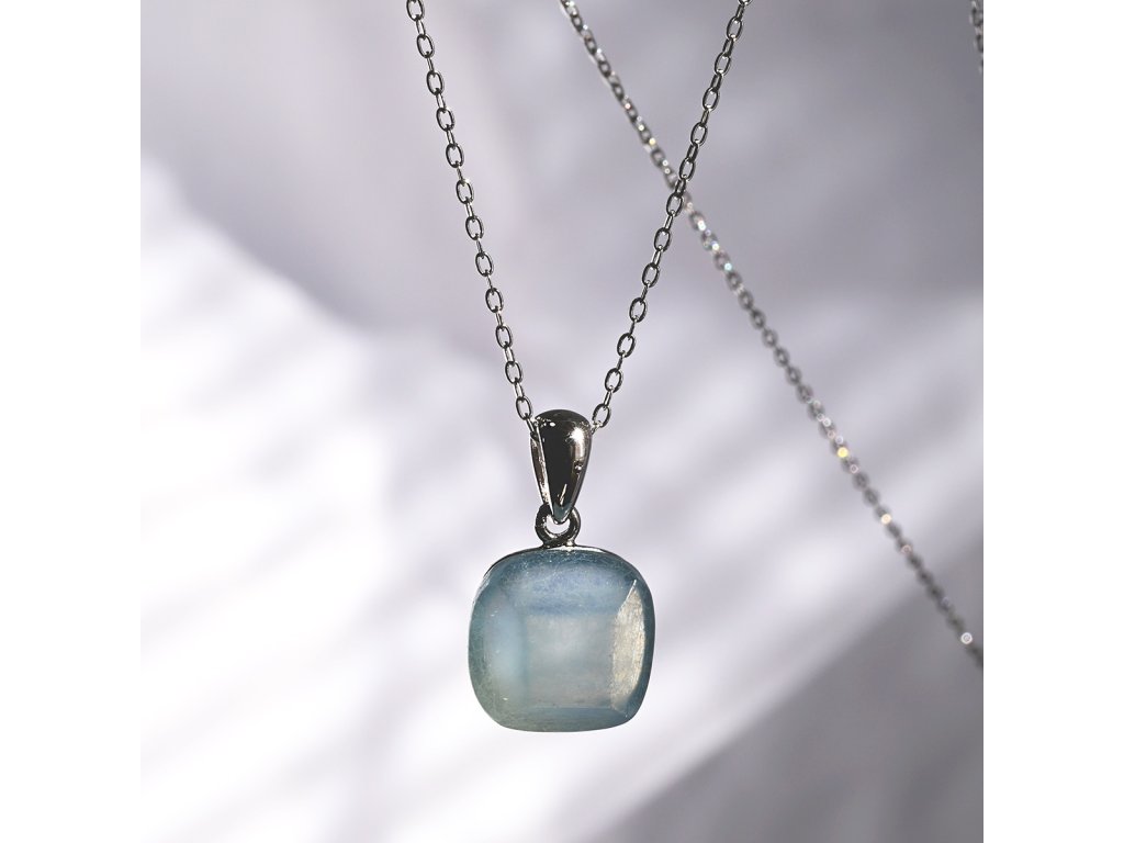 Náhrdelník je vytvořen ze stříbra ryzosti 925/1000 s povrchovou úpravou rhodiem, která dodává šperku čistý a zářivý lesk. Čtvercový přívěsek je zdoben přírodním akvamarínem s charakteristickou ledově modrou barvou. Jemné hrany kamene jsou broušeny s mimořádnou pečlivostí a vytvářejí křehkou hru světla, která připomíná ledové krystaly.