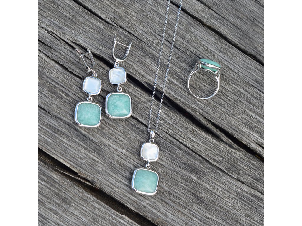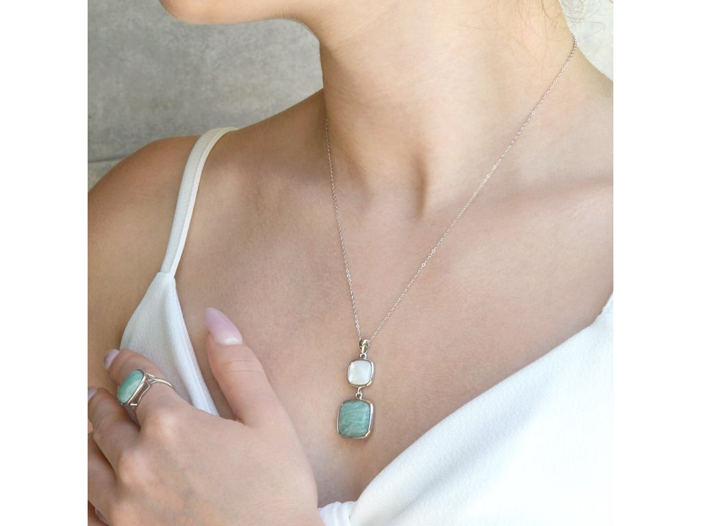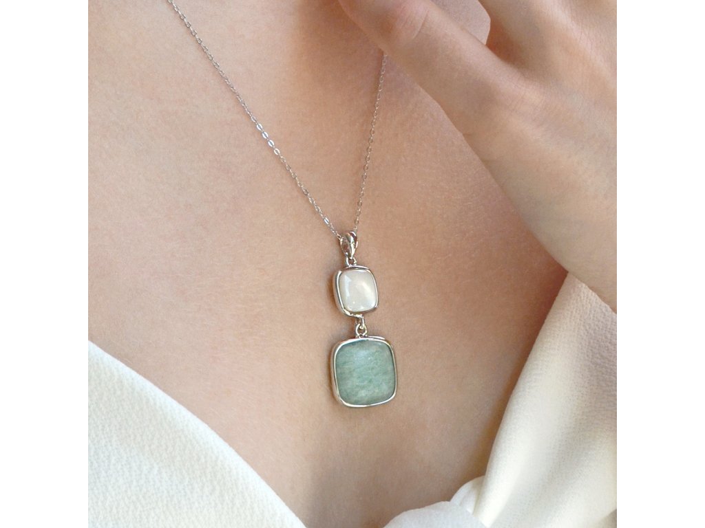 Náhrdelník s přívěskem je uměleckým dílem, které spojuje dokonalý lesk rhodiovaného stříbra 925/1000 s výjimečnou krásou přírodních materiálů. Luxusní přívěsek ve tvaru dvou nad sebou zavěšených čtverců vytváří jedinečnou kompozici - větší čtverec osazený sytým zeleným přírodním amazonitem symbolizuje divokou energii přírody, zatímco menší čtverec vyplněný jemnou bílou perletí přináší křehkou eleganci a klid.