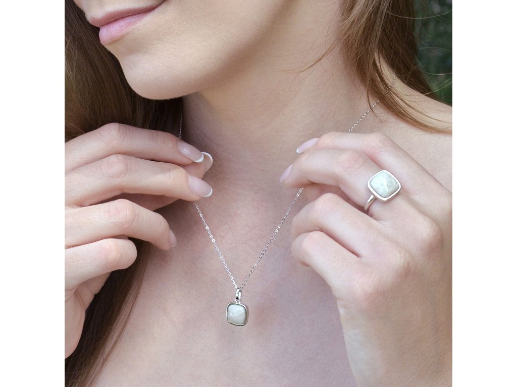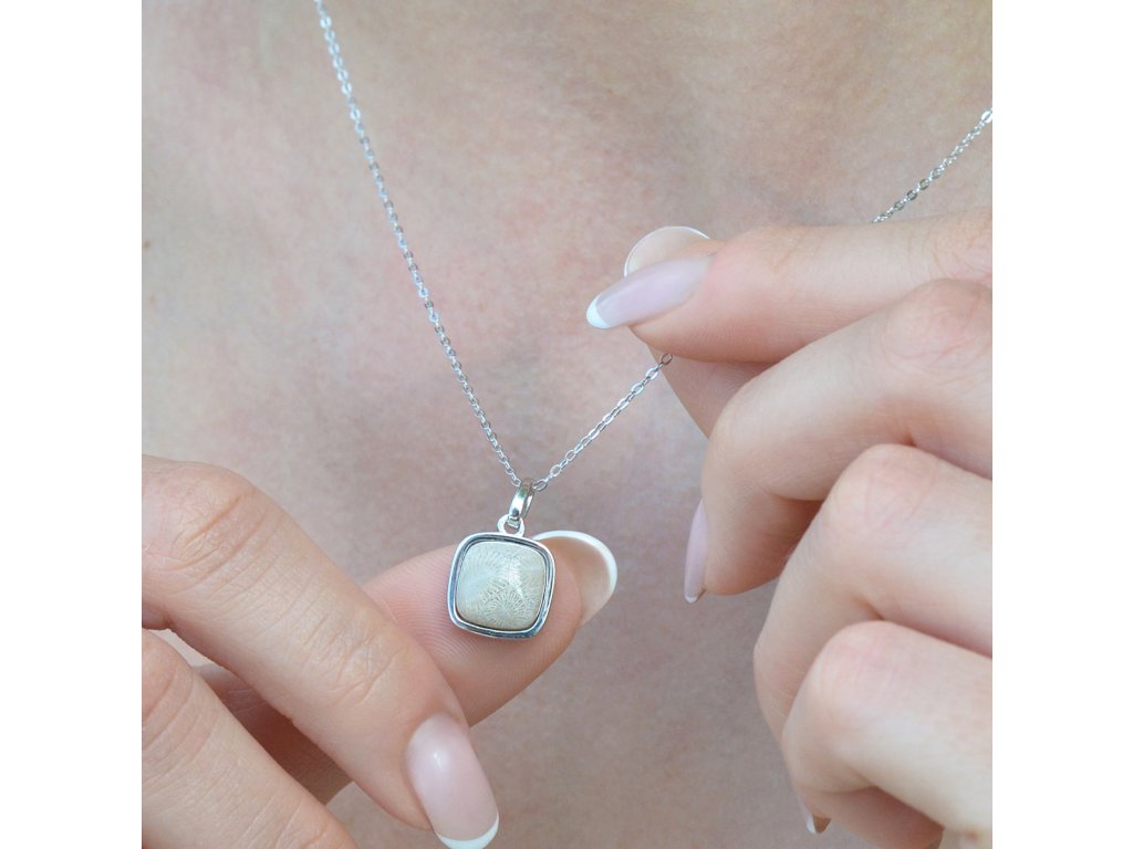 Náhrdelník s přívěskem je vyroben ze stříbra ryzosti 925/1000 s precizní rhodiovou úpravou, která dodává šperku zářivý lesk a zároveň ho maximálně chrání proti oxidaci. Přívěsek ve tvaru čtverce je vyplněn pravým zkamenělým korálem, který uchovává tajemství mořských hlubin z dávných dob. Jeho jemná struktura a tlumené barvy vyprávějí příběh času, trpělivosti a nepřetržitého přírodního cyklu