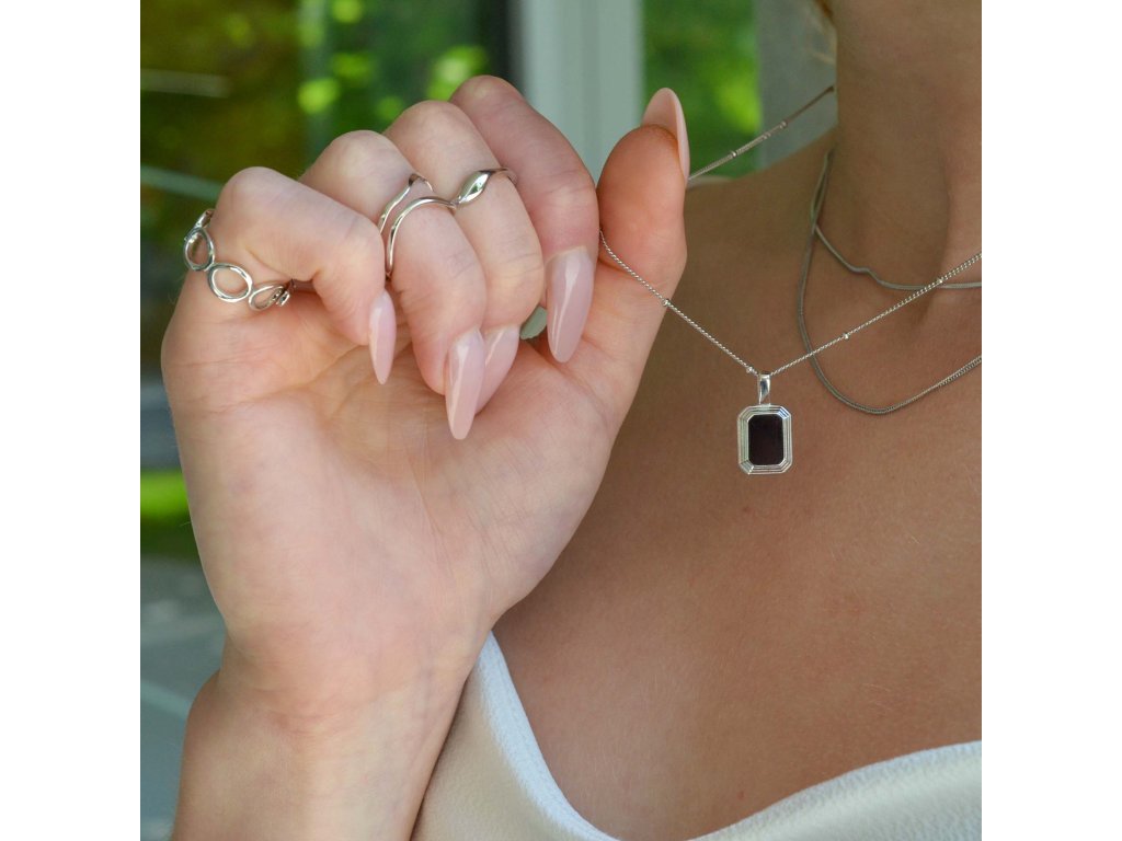 Stříbrný náhrdelník s perletí a černým achátem nabízí jedinečný oboustranný design, který vám umožní měnit vzhled šperku podle nálady či příležitosti. Na jedné straně se nachází nádherná syntetická bílá perleť, která dodává šperku jemný lesk a sofistikovanost, zatímco druhá strana ukrývá fascinující syntetický černý achát, jenž přináší tajemnou a elegantní eleganci.
