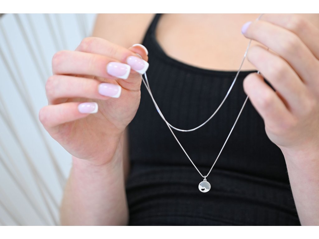 Elegantní stříbrný náhrdelník s moderním přívěskem ve tvaru lesklé placičky navíc s malým srdíčkem uvnitř. Jednoduchý a nápaditý design. Jděte s módou!